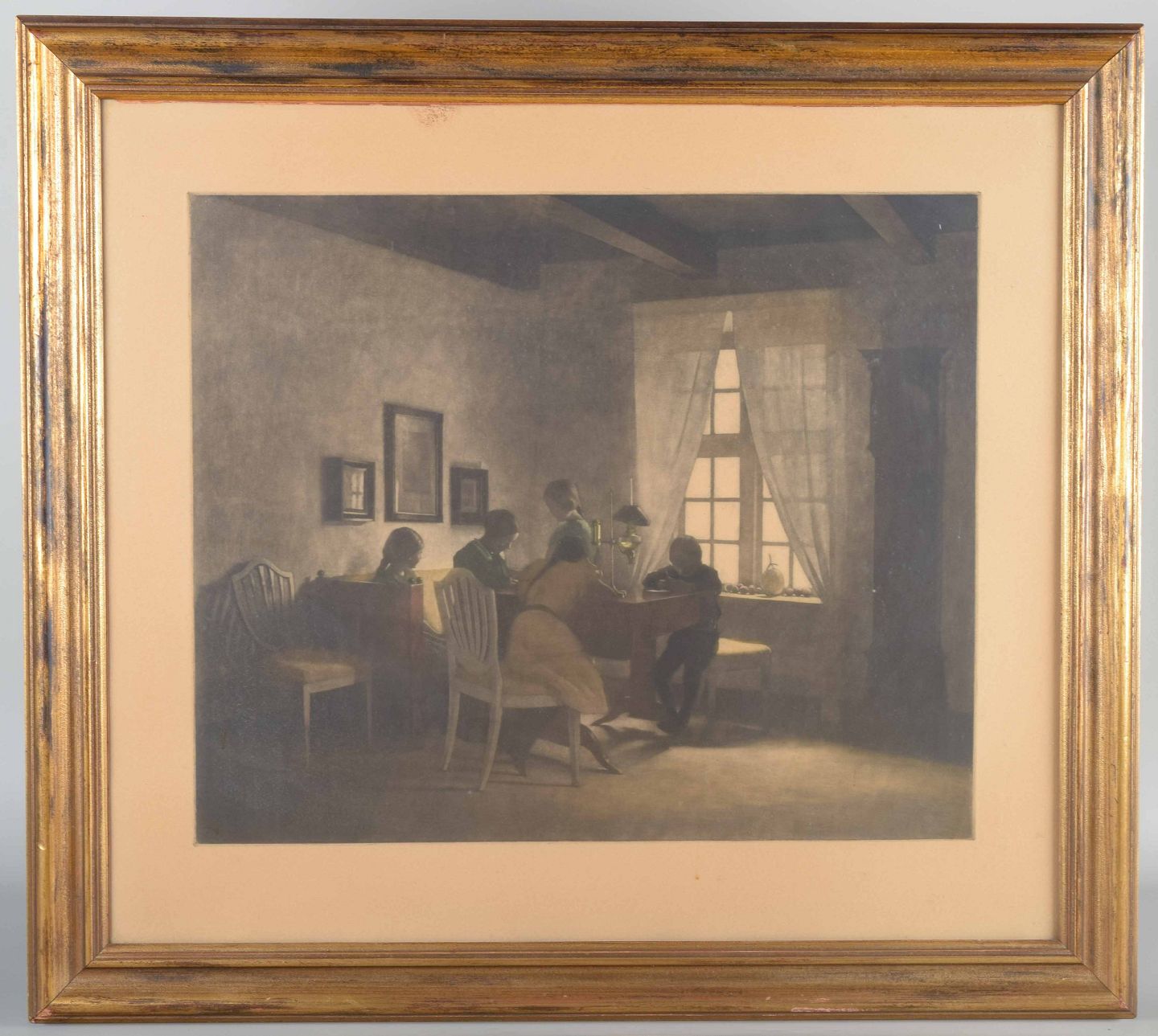 Et stemningsfuldt interiørmotiv af Peter Ilsted, hvor en gruppe personer er samlet omkring et bord i et dæmpet, nordisk lysindfald. Kompositionen fremhæver Ilsteds karakteristiske brug af ro, enkelhed og lys, som skaber en intim og næsten tidløs atmosfære. Værket kan dateres til ca. 1910–1925, Ilsteds modne periode, hvor han forfinede sin koloristiske mezzotint-teknik.