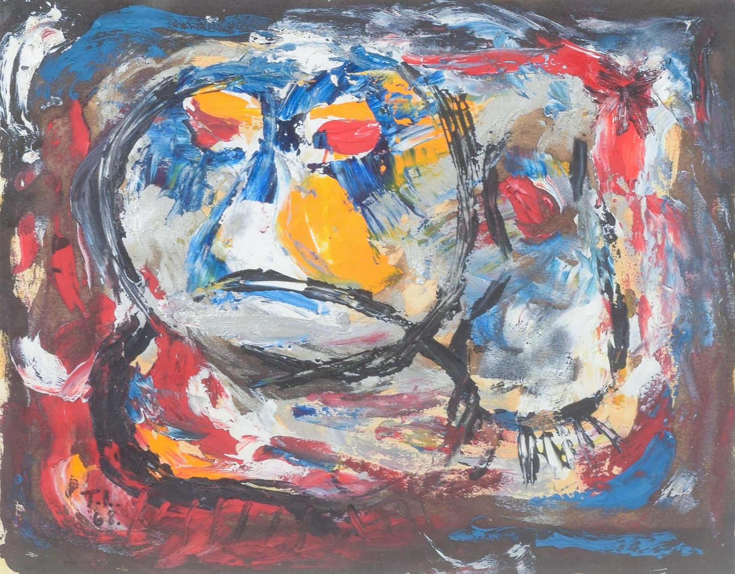 Et ekspressivt værk af Tom Lindhardt med kraftige penselstrøg og intense farver i blå, rød, gul og sort. Værket er signeret og dateret “T.L. 68” i nederste venstre hjørne.