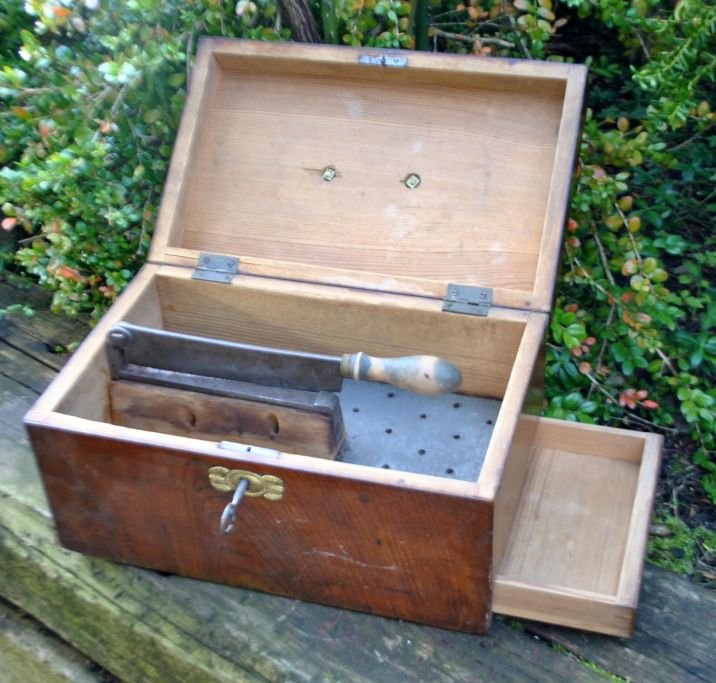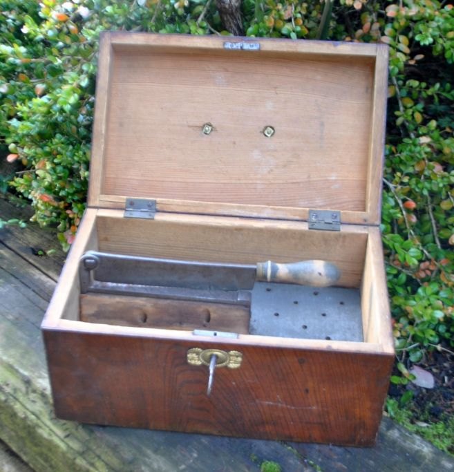 Sukkerkasse i poleret elmetræ, 19. årh. Med huggekniv, perforeret bund og skuffe. Inkl. lås med nøgle og messinghåndtag. H: 19 cm. B: 36,5 cm. D: 22 cm.