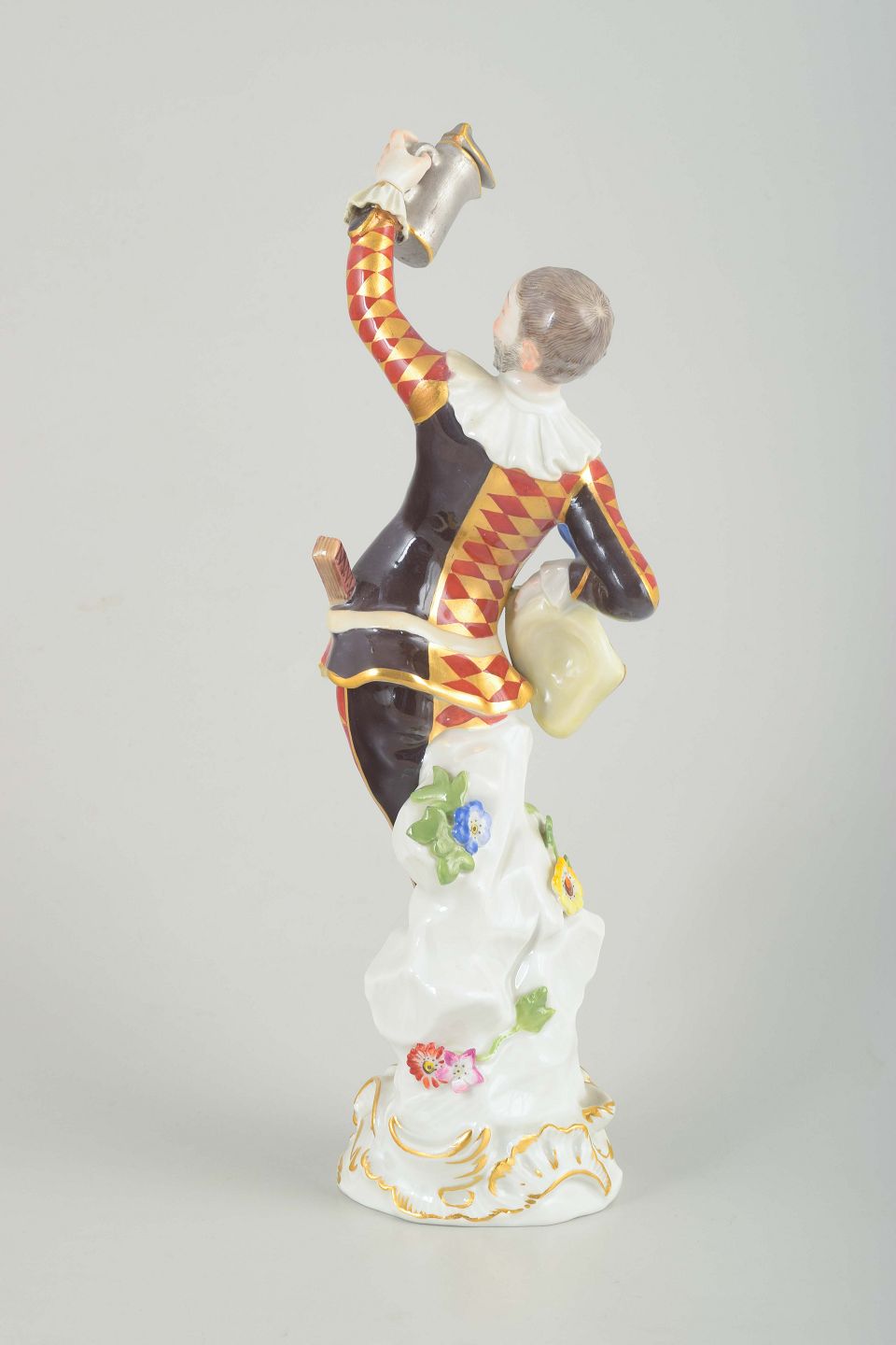 Pragtfuld og detaljerig porcelænsfigur af Harlekin i klassisk Commedia dell’arte-dragt, udført i de fineste farver med overdådig håndmalet staffering i rødt, guld og sort. Figuren skildrer Harlekin i festlig positur med løftet krus, rigt dekoreret med gulddetaljer og stående på en rokoko-inspireret base med blomster.