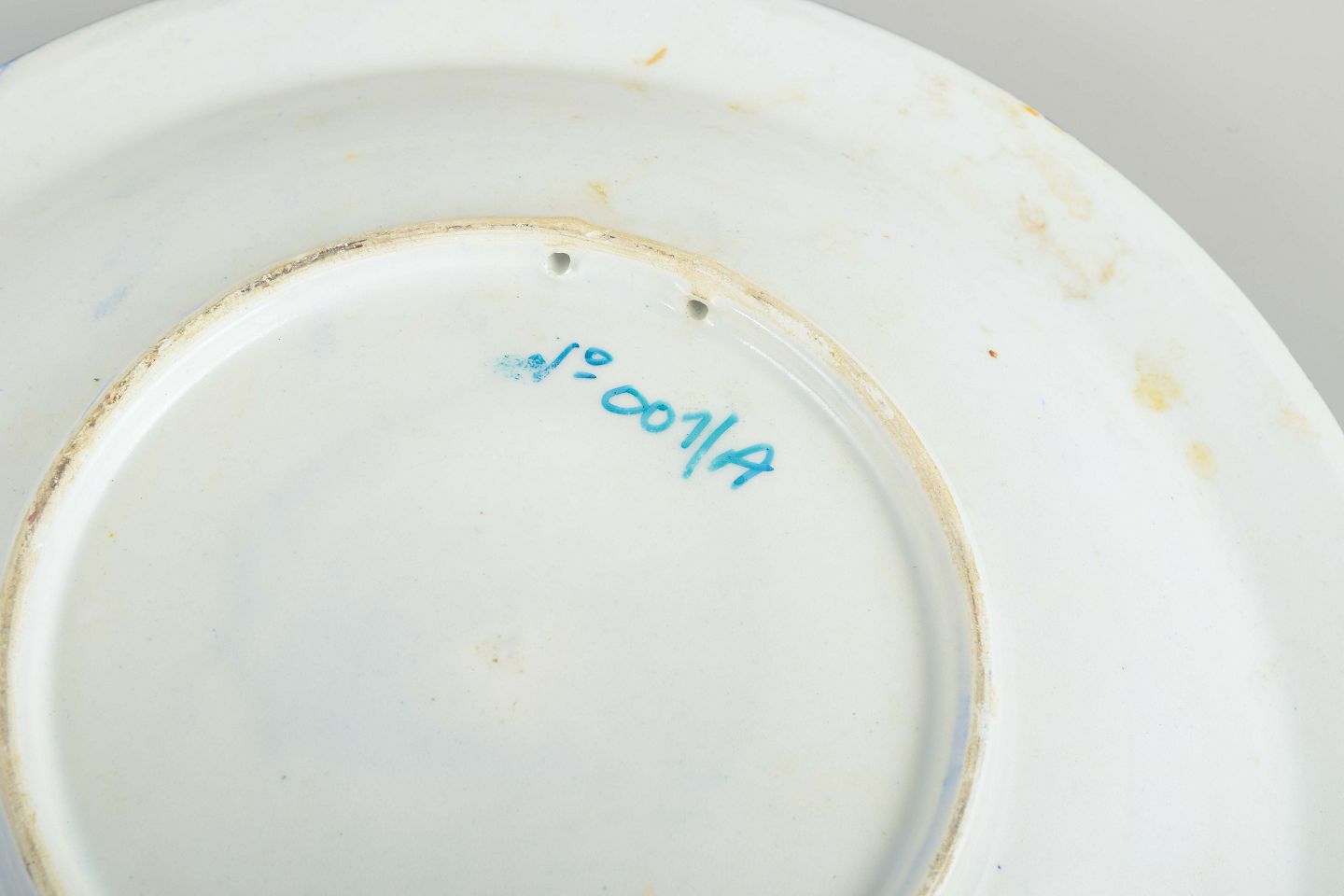 Drejet fajancefad med håndmalet dekoration i blå, orange og hvide toner. Geometrisk og blomstret mønster med klare folkloristiske træk.