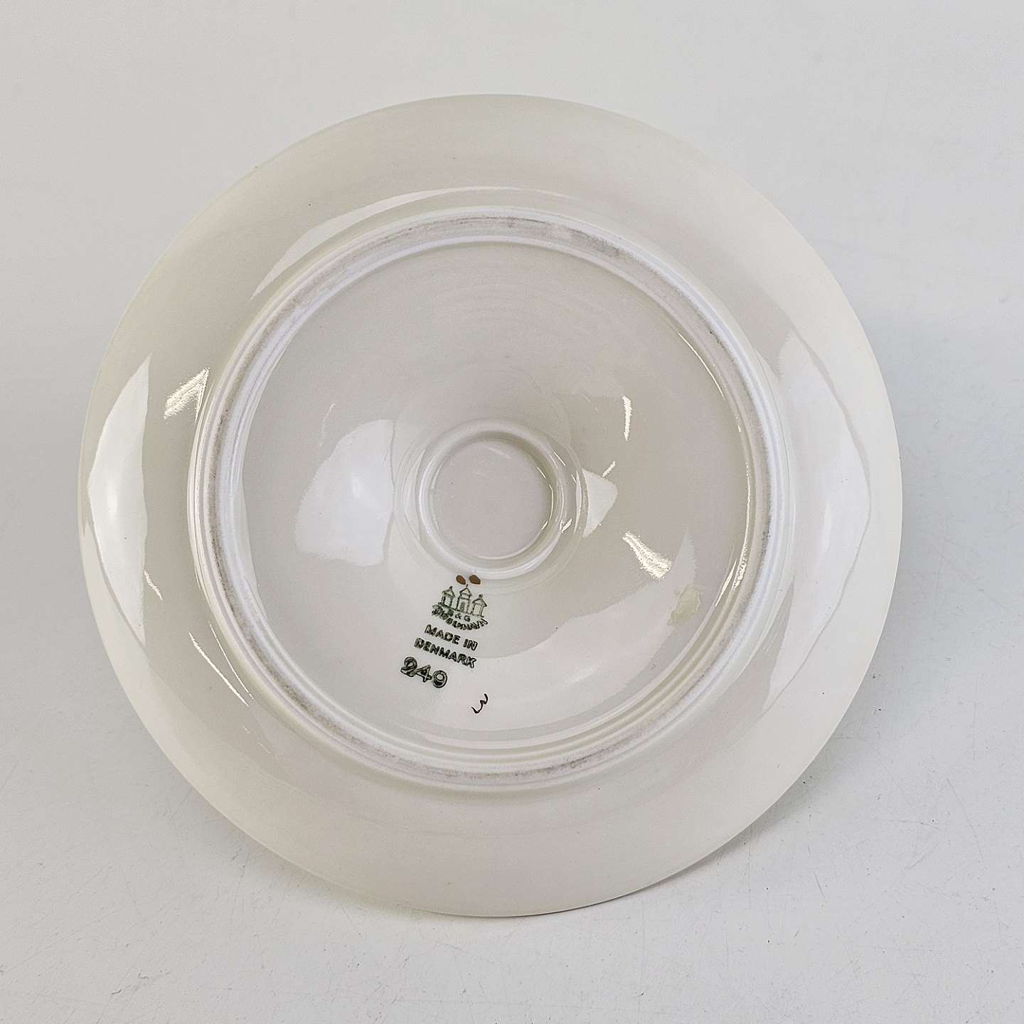 Kaktus er cremefarvet porcelæn i skælform, dekoreret med kaktusblomster og guldkant