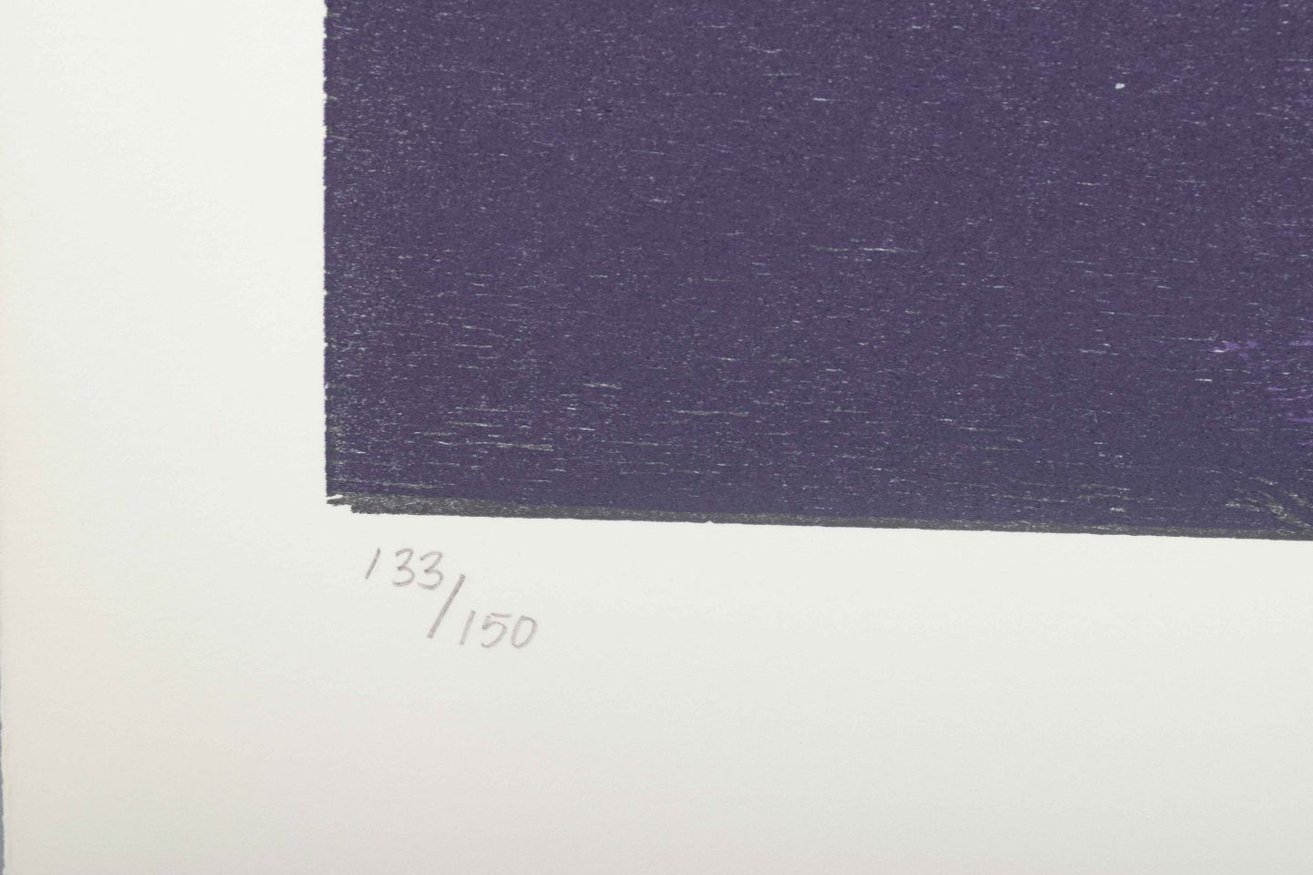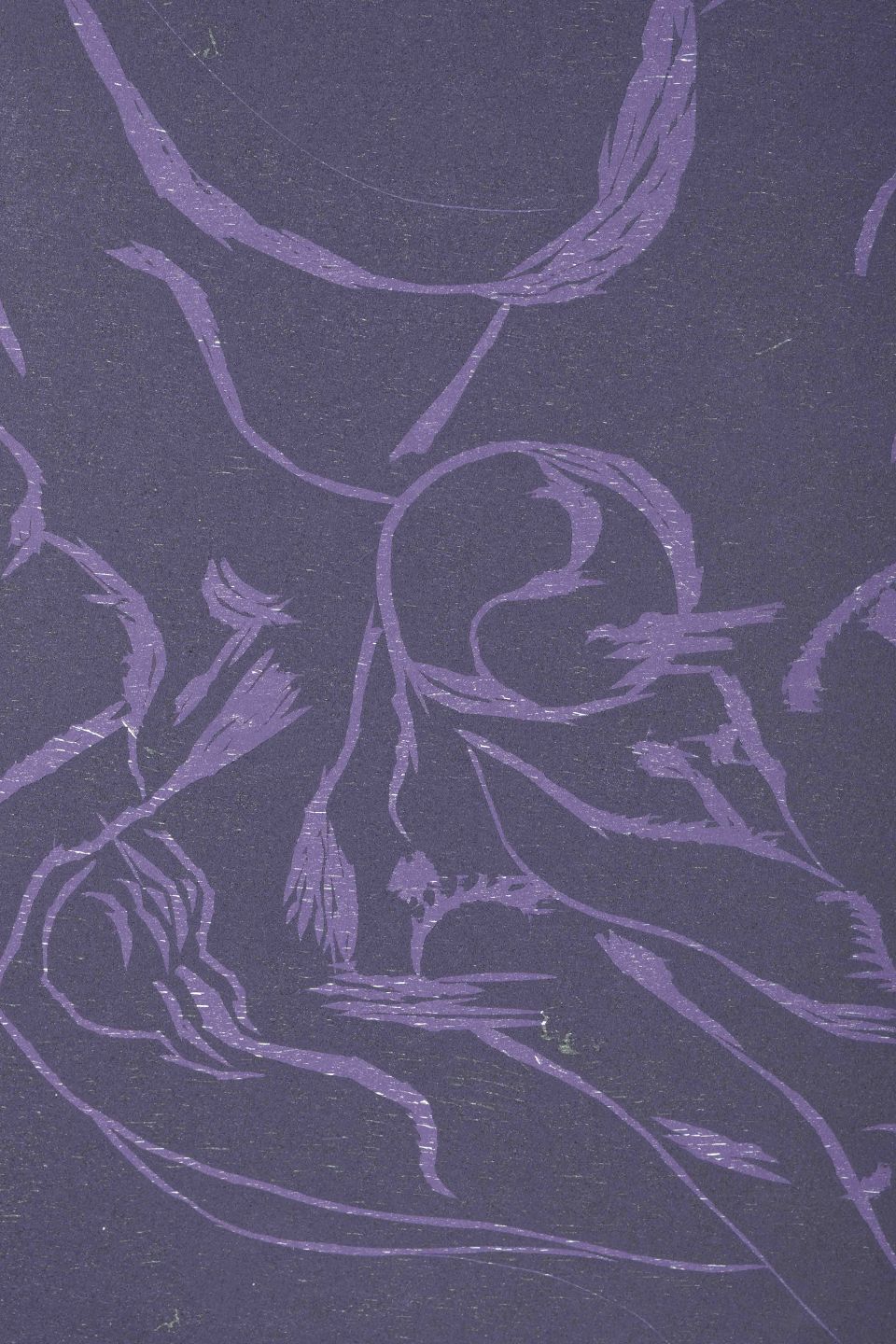 Abstrakt komposition i violette toner, hvor enkle linjer og organiske former danner et næsten kalligrafisk billedsprog. Et karakteristisk grafisk blad af billedhuggeren, der gennem hele sit virke arbejdede med ekspressive udtryk på tværs af materialer.