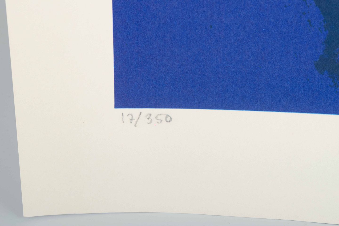 Et ekspressivt abstrakt tryk med organiske, farvemættede flader i blå, rød, grøn og gule nuancer. Kompositionen er præget af rytmiske bevægelser og kontraster, som skaber en levende og dynamisk billedflade, karakteristisk for Ernsts arbejde med farver og organiske udtryk.