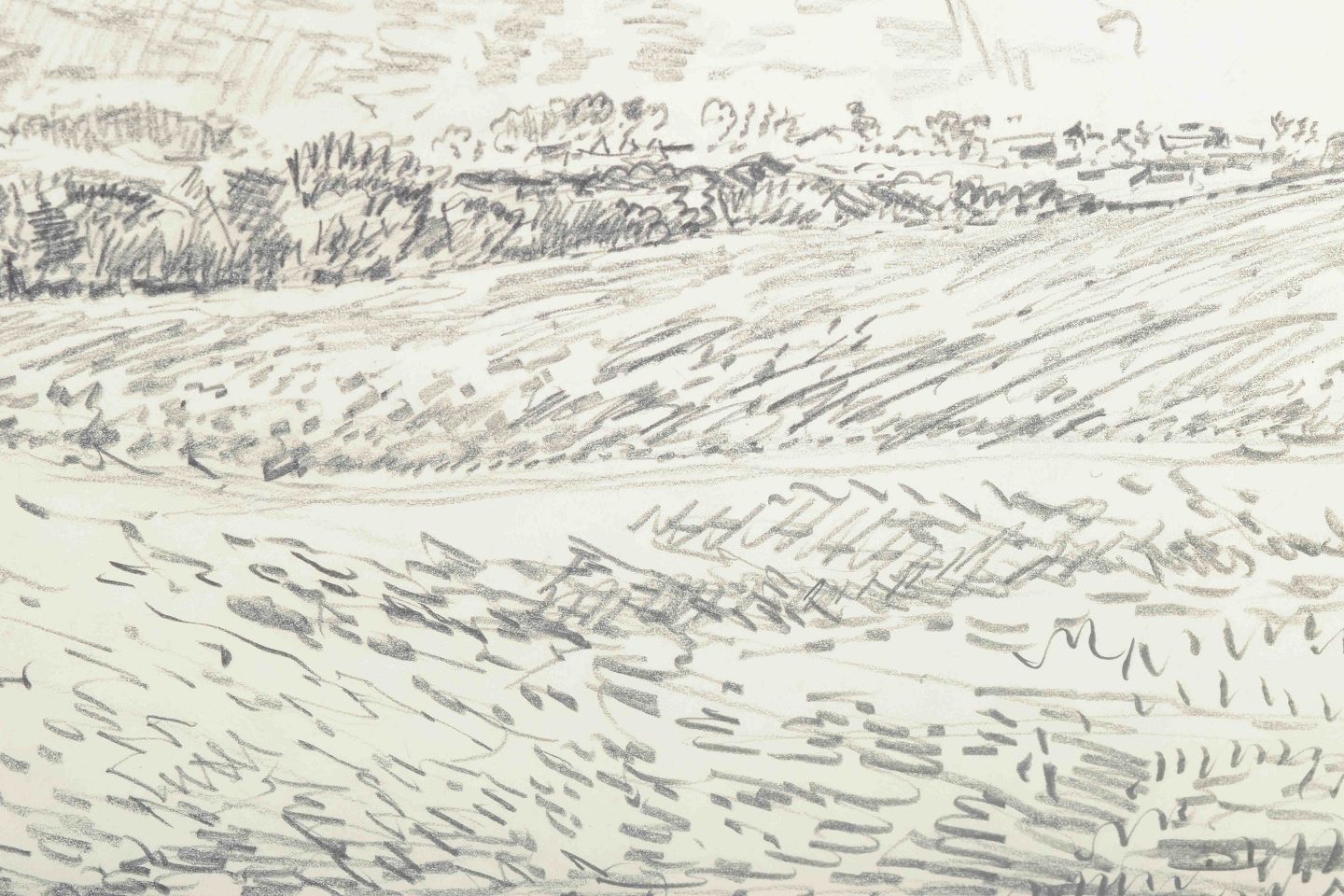 Et stemningsfuldt landskab udført i blyant, hvor horisonten og himlen dominerer billedet med rolige, rytmiske streger. Værket indfanger naturens bevægelse og atmosfære med en enkel, men levende stregføring.