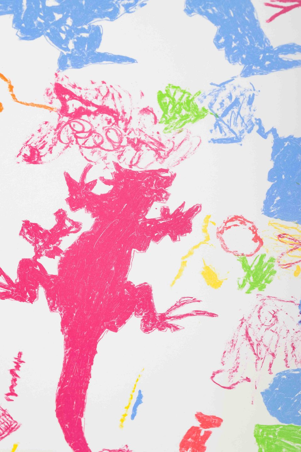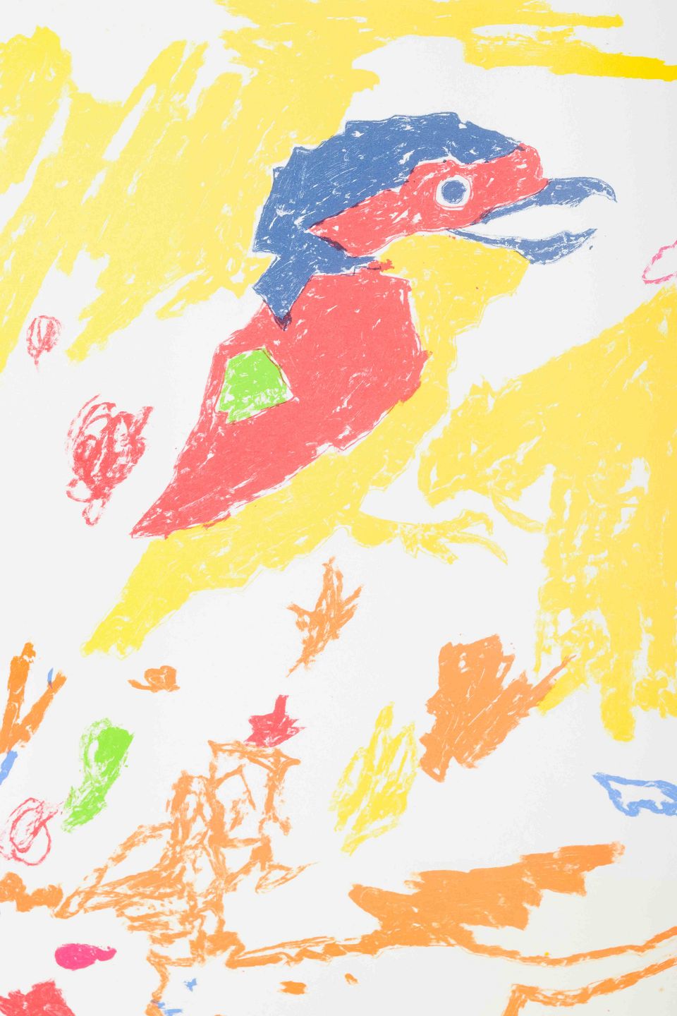 Et fantasifuldt og farverigt værk med figurer, der minder om dyr og fugle, udført i stærke kontrastfarver. Kompositionen har et legende og spontant udtryk med inspiration fra naturens former.