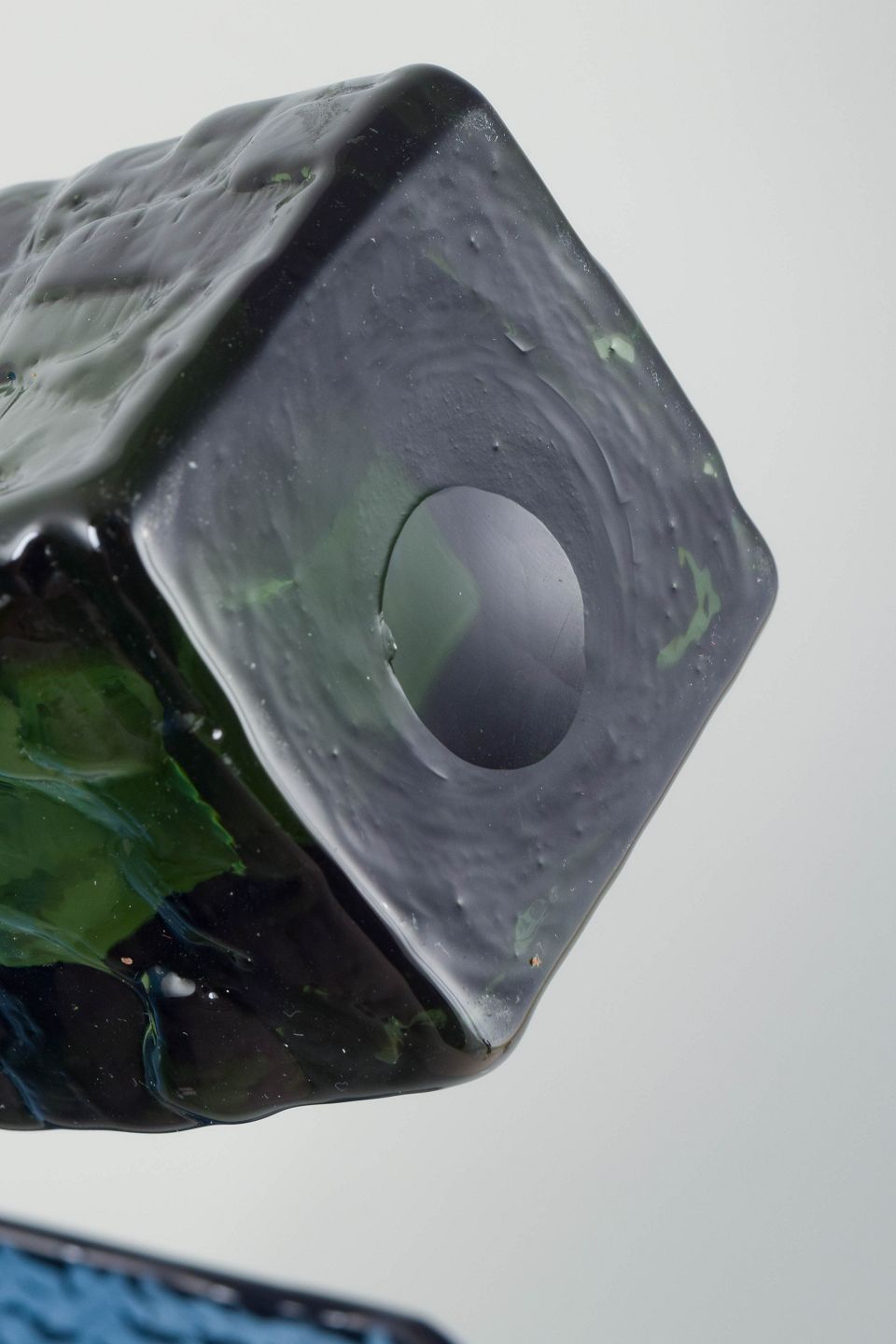 Rektangulær vase i blåt glas, dekoreret med dybt reliefmønster og en rustik overflade. Vasens kubiske form understreges af de geometriske detaljer i strukturen.