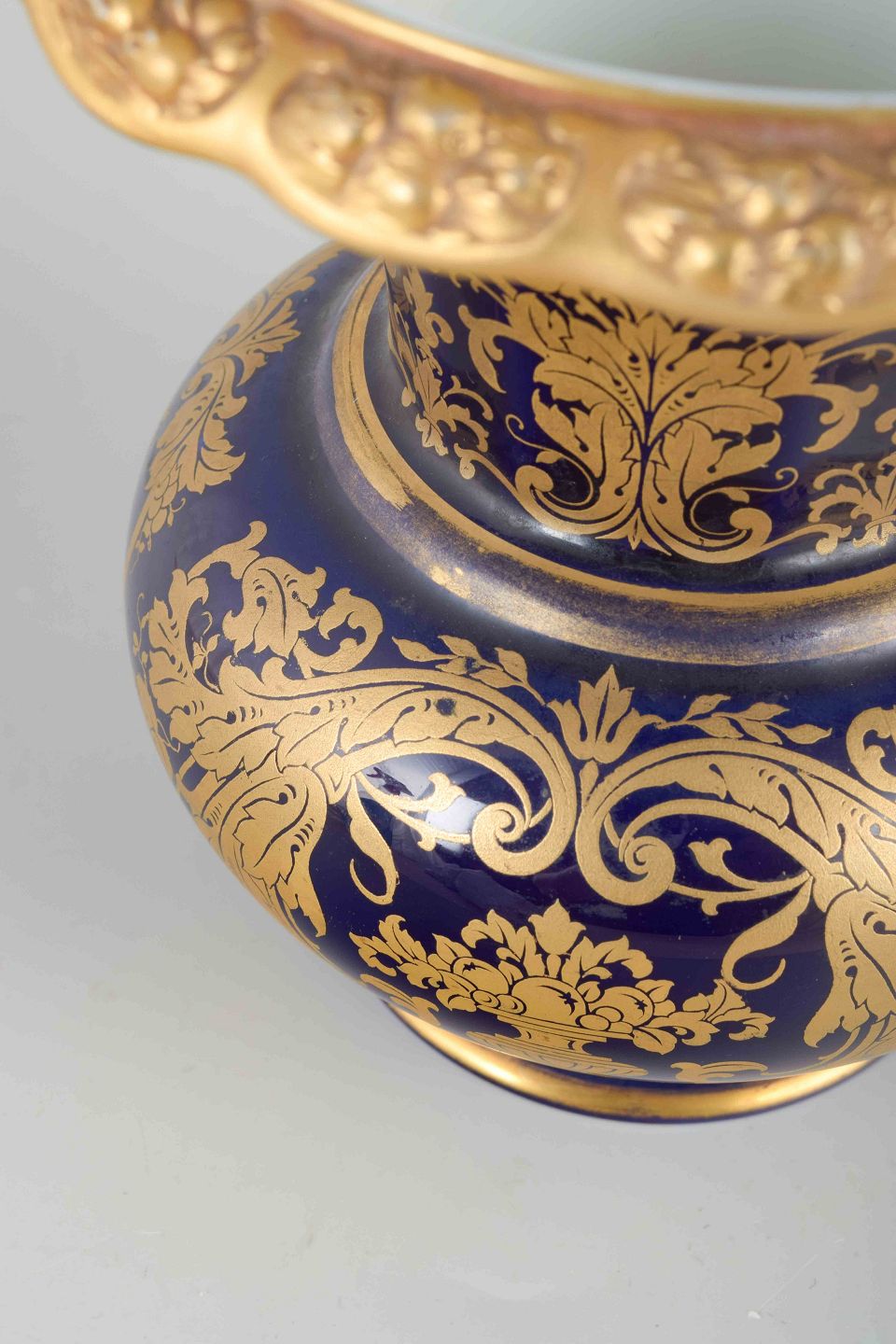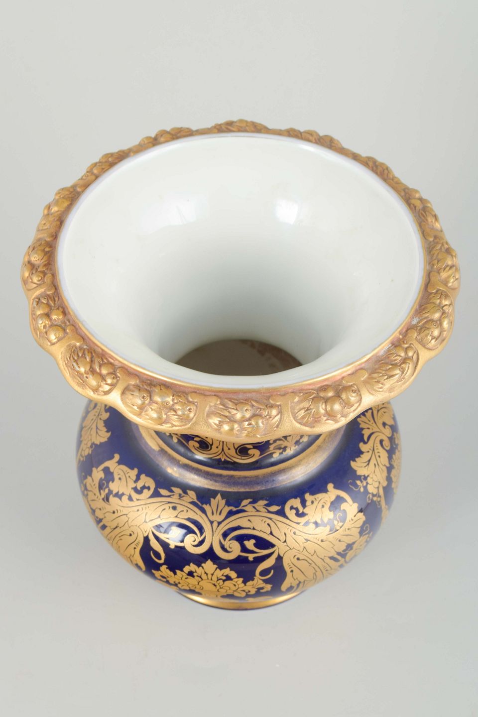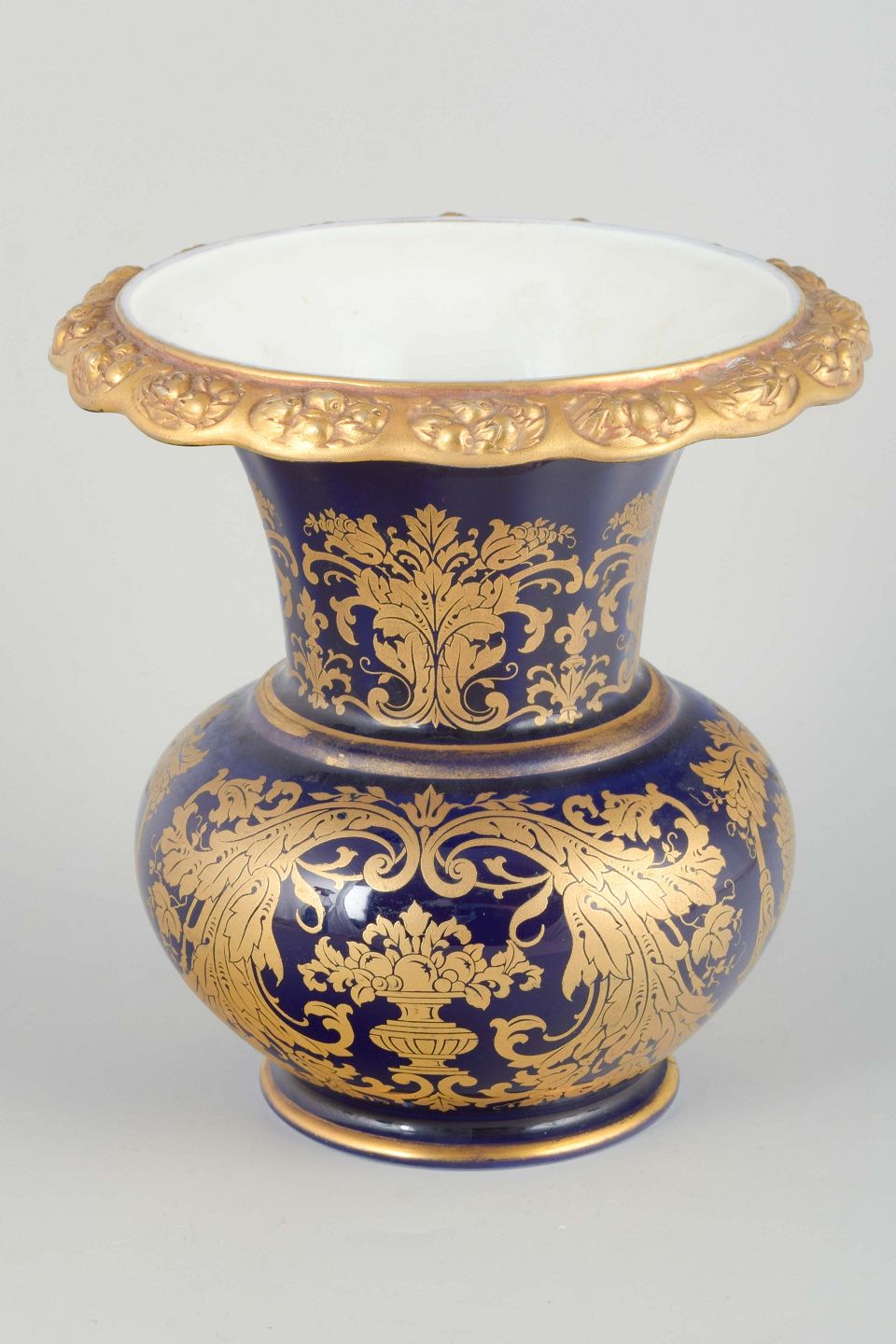 Decorative porcelain vase with deep cobalt blue glaze and rich gilded floral motifs. Elegantly shaped with a scalloped gilt rim.