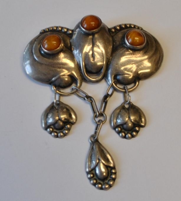Dansk jugend vedhæng i sølv med rav, 20. årh. Dekoration i form af bladværk. Stemplet 830 og utydelig mestermærker. B.: 7 cm. H.: 9 cm.