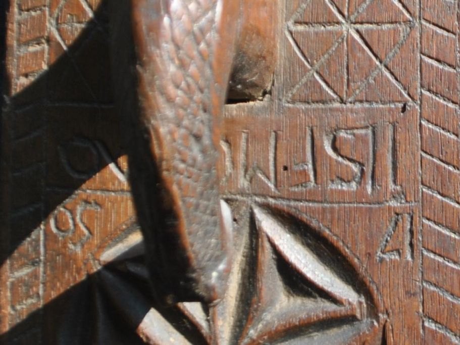 Dansk manglebræt, 1759. Manglebræt i bøgetræ med talrige karvskæringer og intialerne: ILSFM DAO 1759. Håndtag i form af skåret hest. L.: 66,5 cm. B.: 12,5 cm.