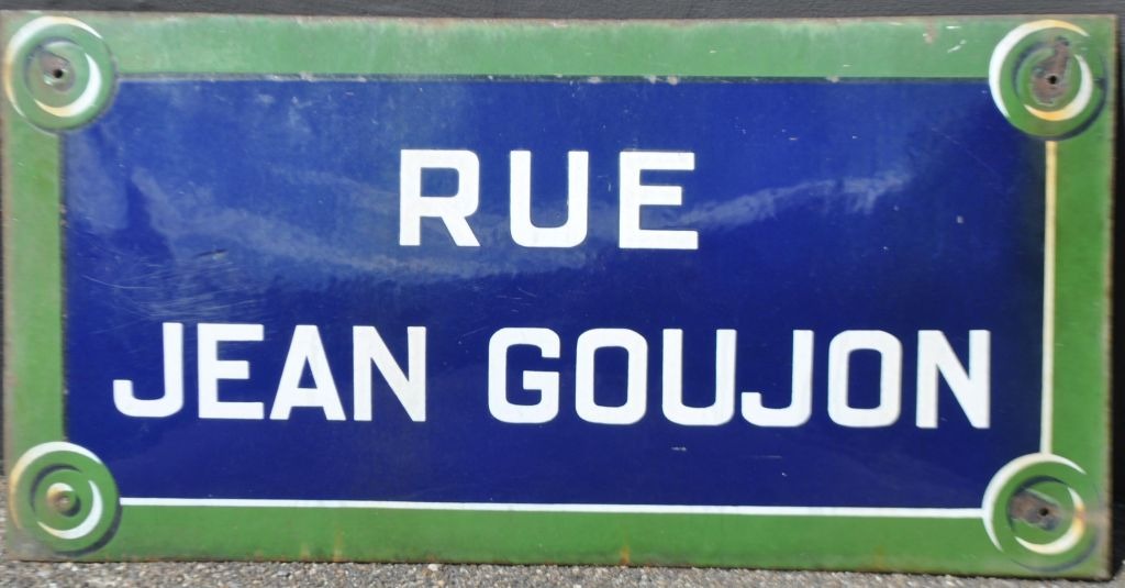 Originalt emaljeskilt fra Rue Jean Goujon, Paris, ca. 1900. Frankrig. I blå, grønne og hvide farver. 70 x 35 cm.
