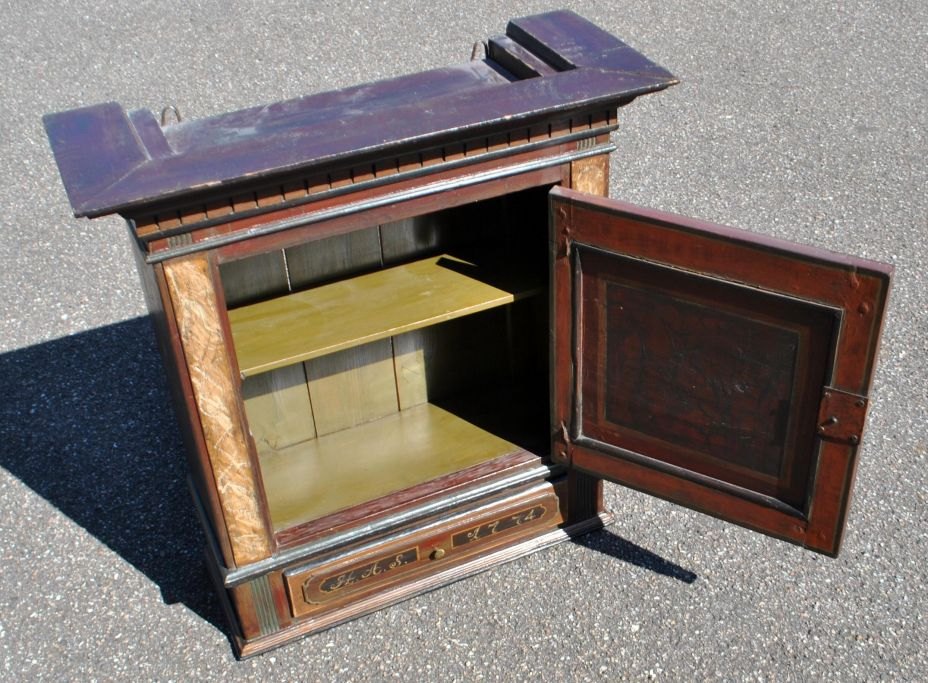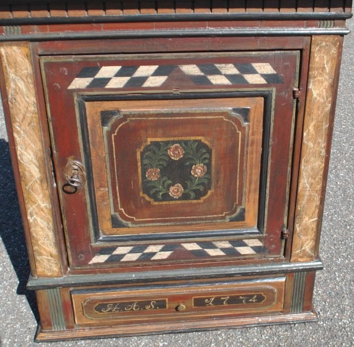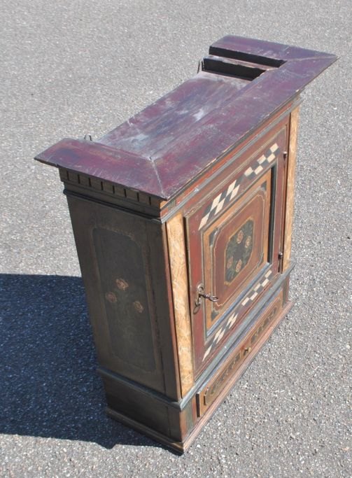 Dansk Louis XVI bemalet hængeskab, 1774. Med tandsnit for oven og søjler i siderne. Med en skuffe. Bemalet med skak tern og blomsterranke i midten på lågen. Indvendig med en hylde - grønmalet. Med initialerne: HAS og 1774 på skuffens forside. H.: 75 cm. B.: 70 cm. D.: 30 cm.