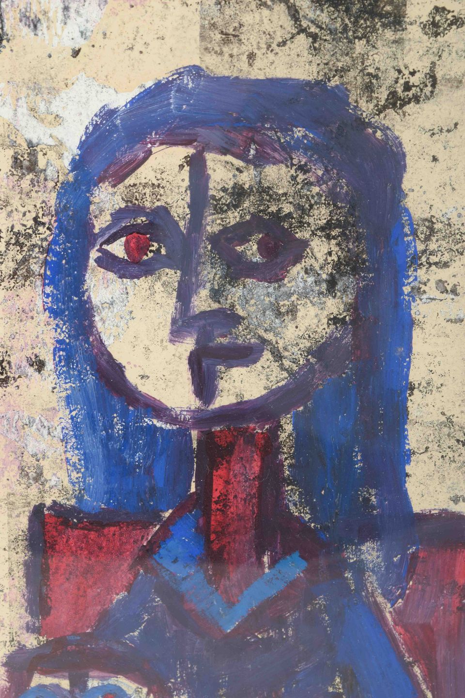 Et ekspressivt figurativt værk i stærke blå og røde toner, hvor moderfiguren og barnet fremstilles med markante konturer og et råt, næsten ikonisk formsprog. Maleriet bærer præg af 1960’ernes eksperimenterende tilgang til farve og figur og udstråler både intensitet og nærhed.