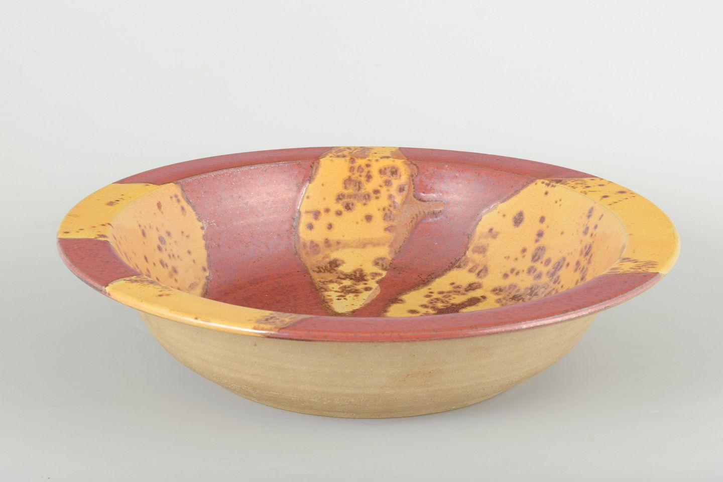Drejet stentøjsskål med rødbrun bundglasur og dekoration i gule, plettede felter i et organisk, abstrakt mønster.