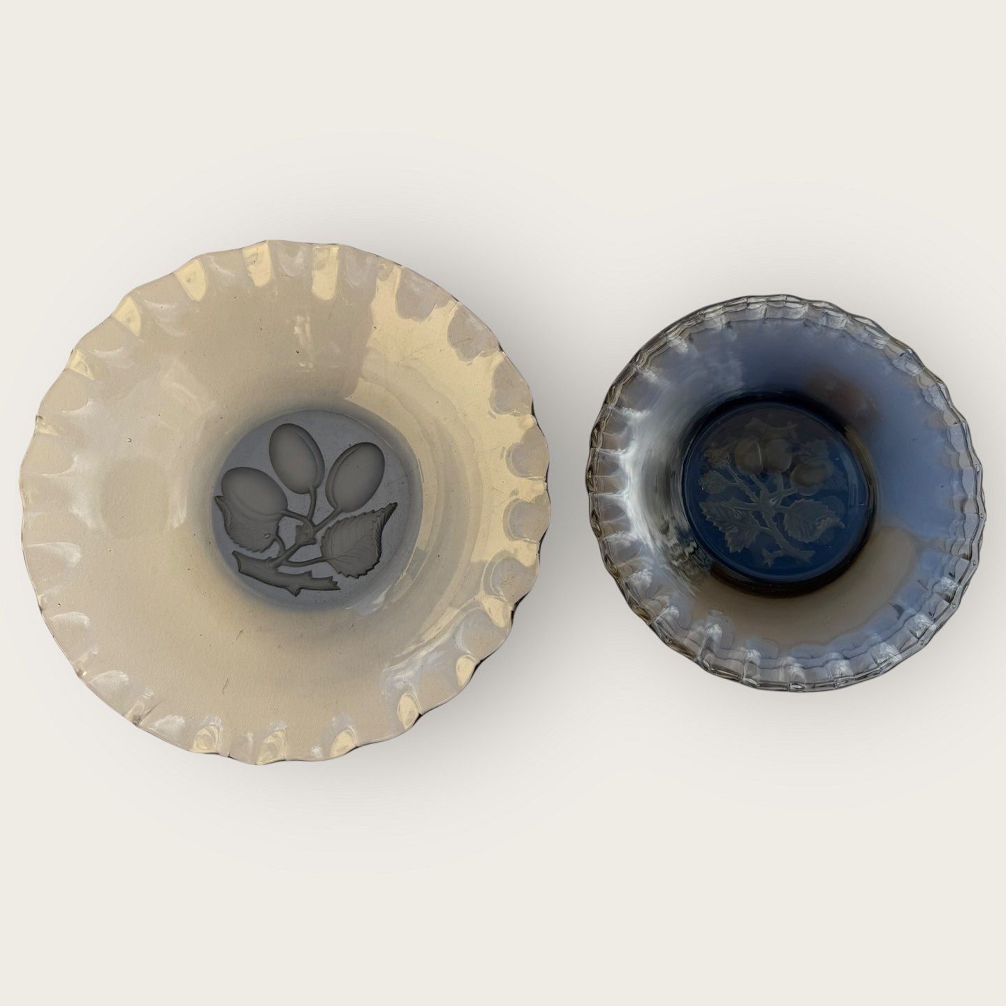 Glasskål og 6 desserttallerkner med blomster / frugt motiv, flæsekant udført i gråtonet glas, skål diameter 21cm, højde 5,5cm, assietter diameter 16,5cm, *fin stand*