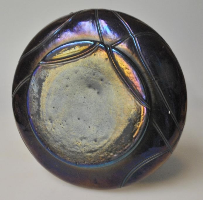Loetz vase, jugendstil, ca. 1900. Af irriseret glas med forløb af stegdekorationer af glas. H.: 29 cm.