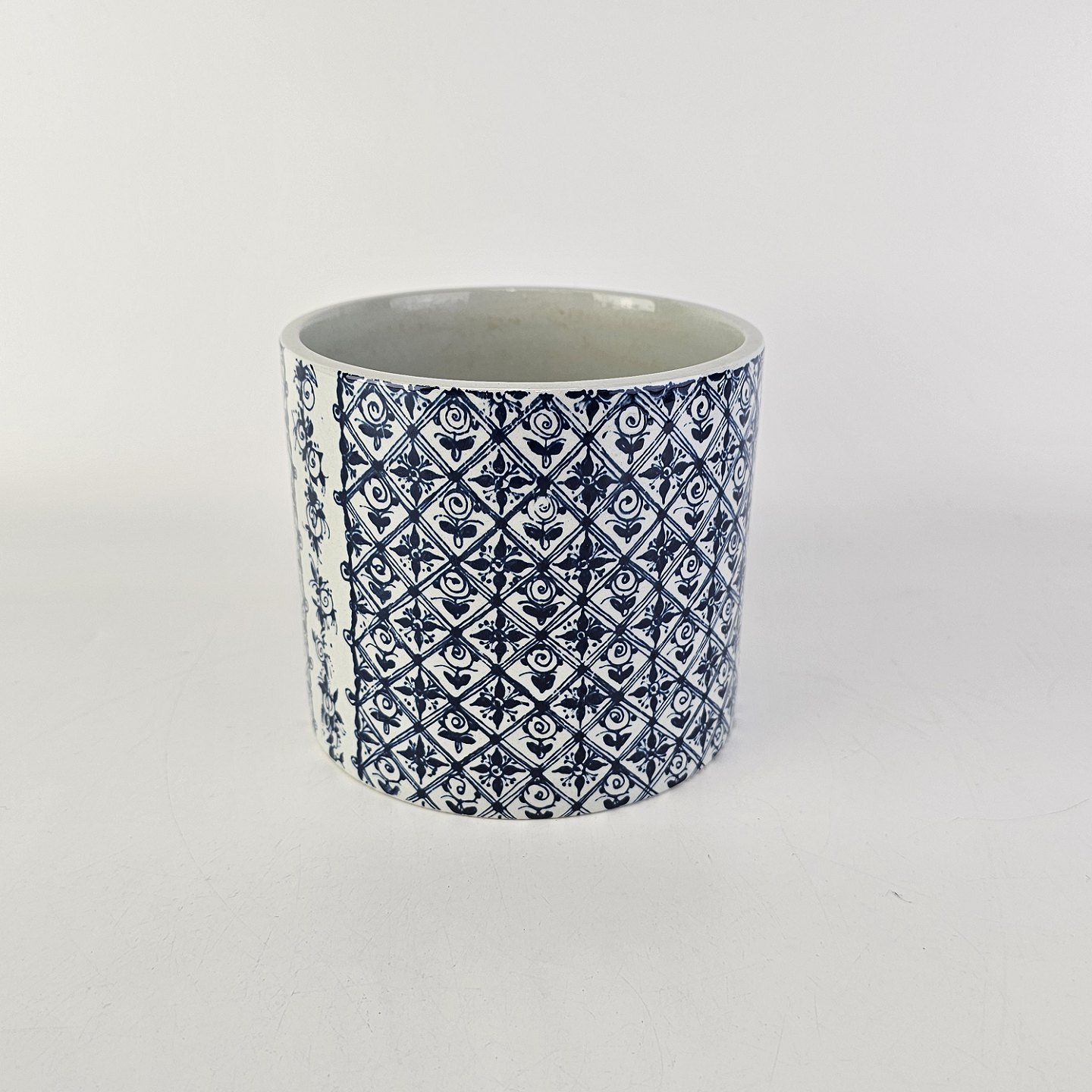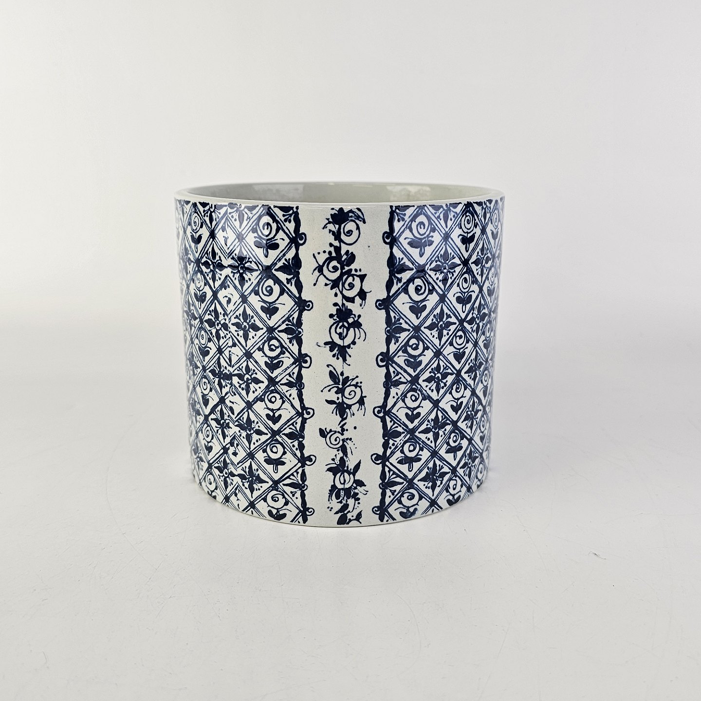 Urtepotteskjuler af keramik med et sort/hvidt mønster af en kvinde og blomster og teksten Koleriker