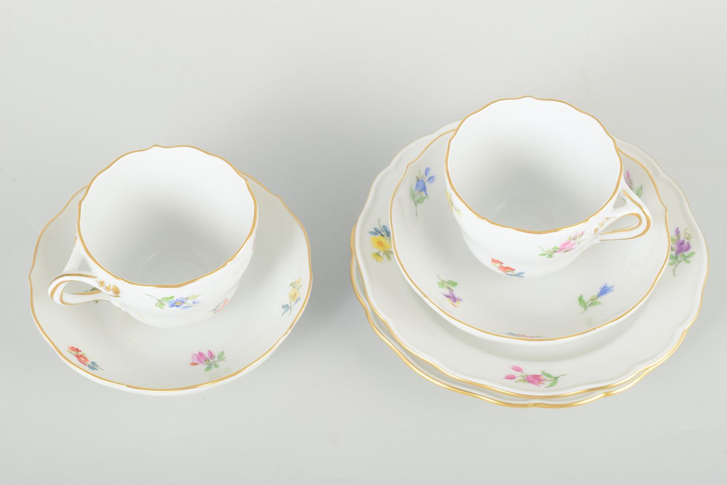 Set consisting of 2 hand-painted mocha cups with saucers and small plates. The porcelain is decorated with multicoloured flowers and gilt rims. Classic Meissen form with elegant curves.