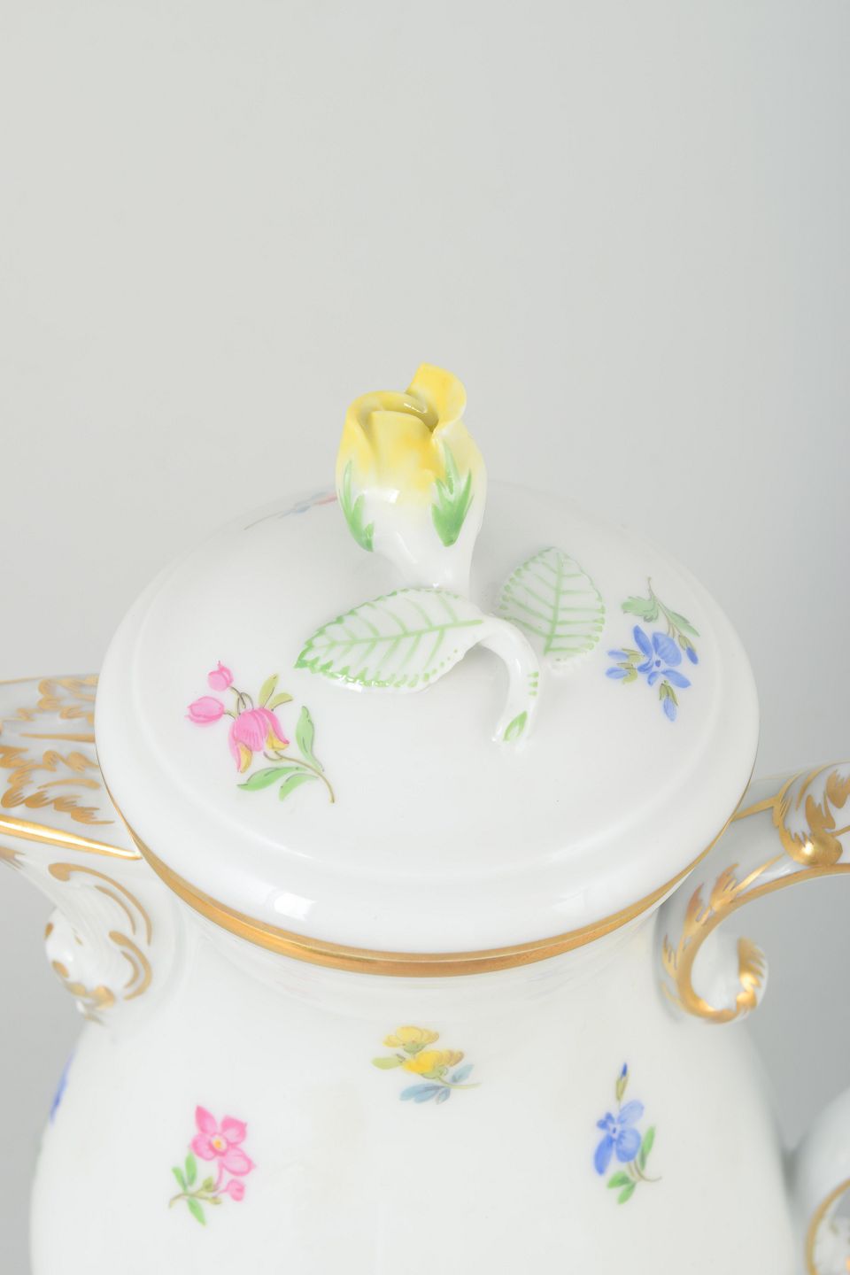 Elegant porcelain coffee pot, hand-painted with multicoloured floral decoration and gilt details. The lid is finished with a porcelain knop in the shape of a flower. Classic curving form with arched handle and spout.