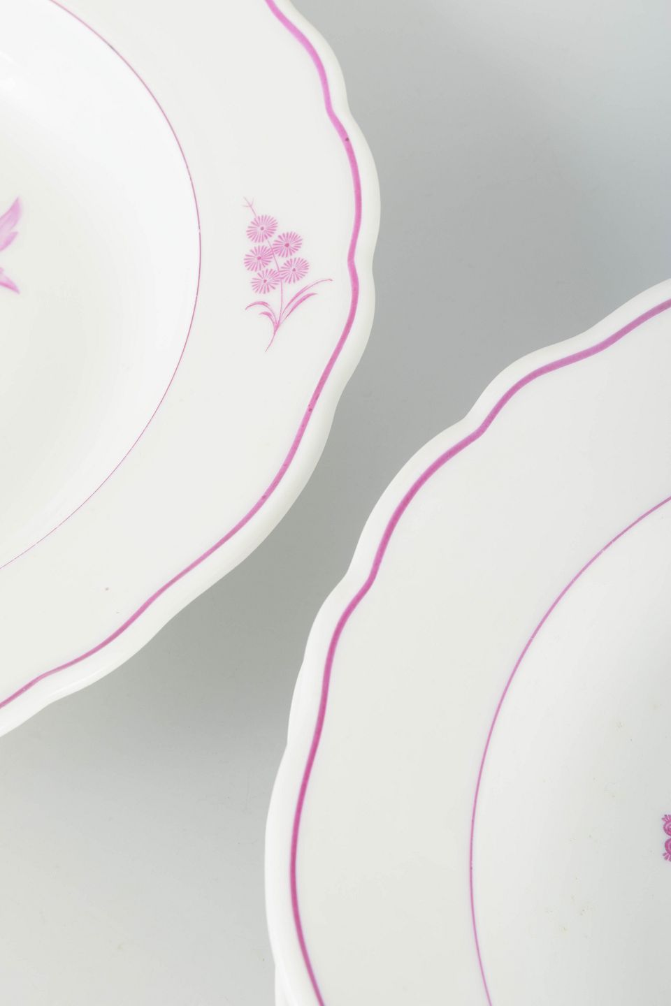 Set of three deep porcelain plates, hand-painted with floral compositions in purple/pink tones. Classic scalloped rims with simple painted detailing.