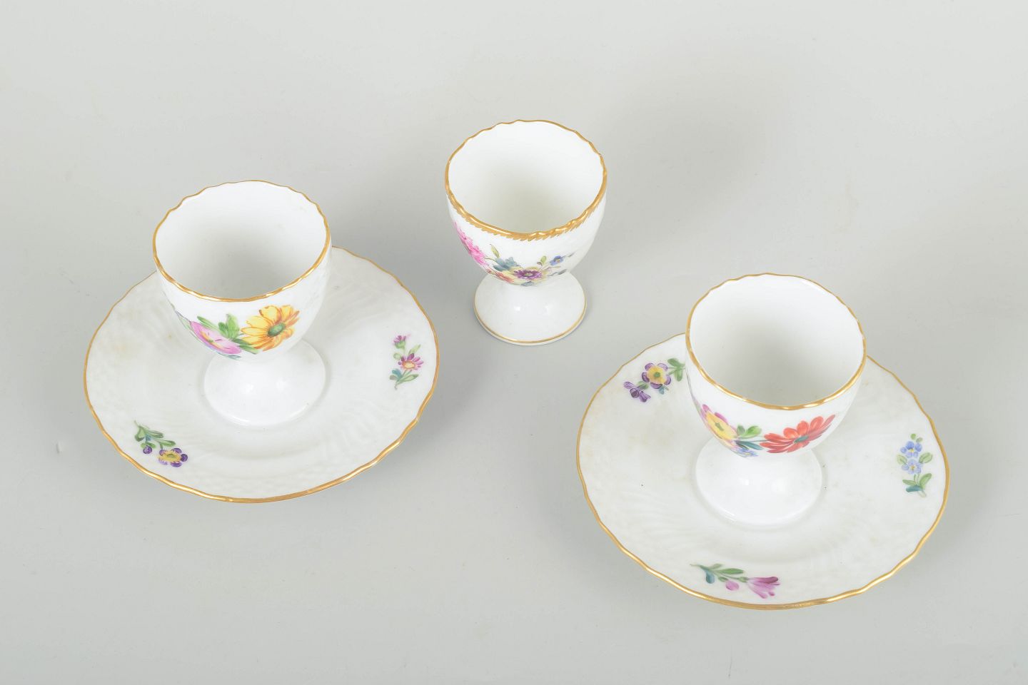 Three porcelain egg cups, two with fixed saucers, decorated with hand-painted flowers in the classic “Saxon Flower” pattern and gilded rim.