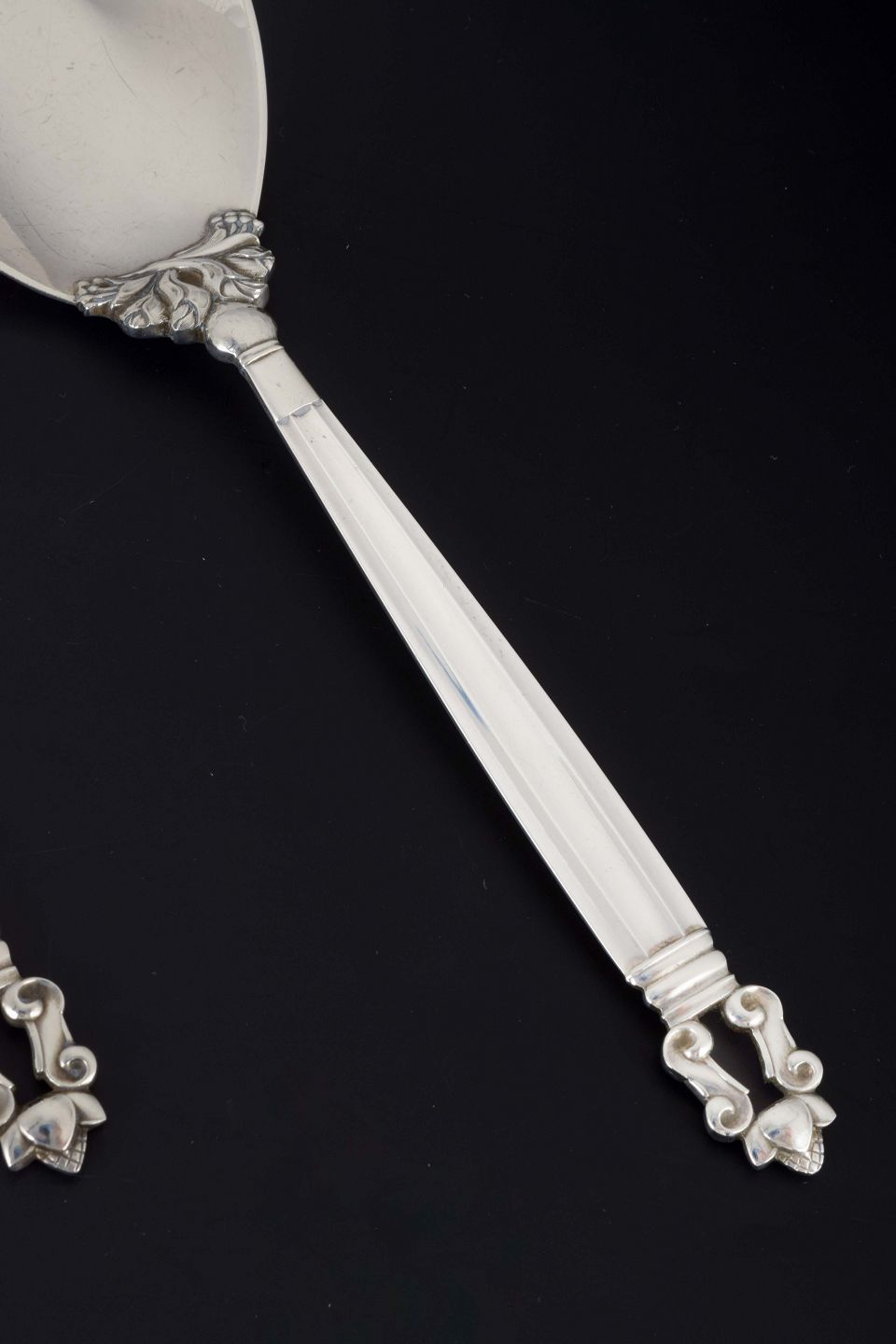 Elegant stort salatsæt bestående af salatske og salatgaffel i det klassiske “Konge / Acorn”-mønster, designet af Johan Rohde i 1915. Skaftet er udsmykket med akantusblad og agernmotiv.
