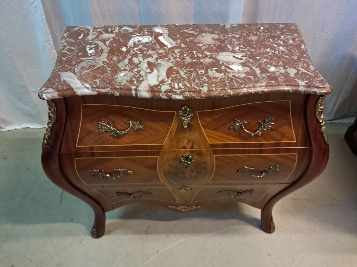 Kommode i fineret mahogni med marmorplade, fra 1980erne.