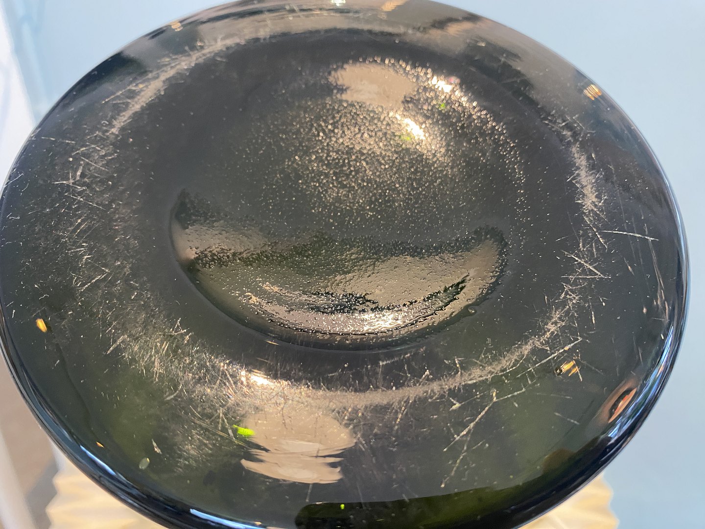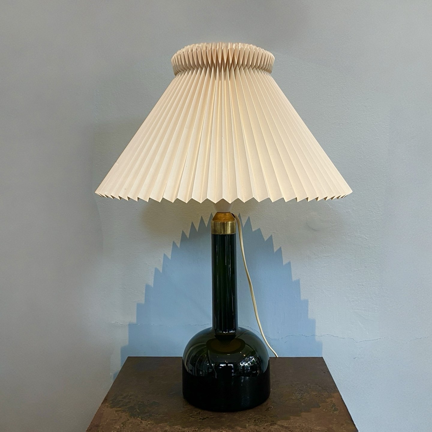 Sjælden Le Klint bordlampe med lampefod af mørk grønt glas monteret med plisseret skærm.