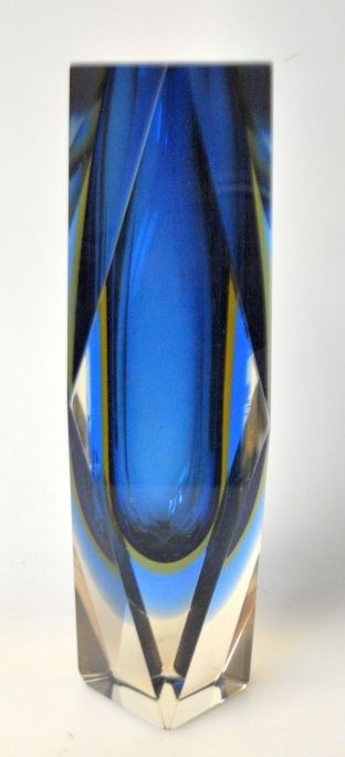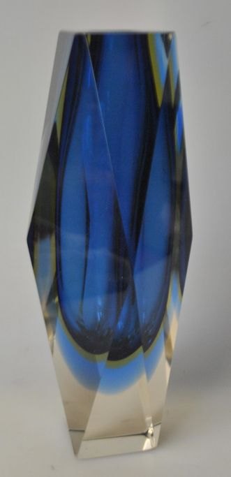 Venetiansk vase - Murano, 1960'erne. Italien. 6 kantet vase. Klart, blåt og gult glas. H.: 20,5 cm.