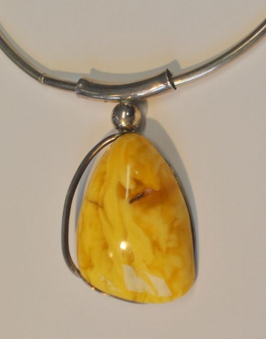 Stort rav halssmykke, Bjarke Holtzmann, Nørre Nebel (efter 2001), Danmark. Halssmykke i sterling sølv med stort poleret mælke rav stykke. Stemplet. Kædelængde.: 38 cm. L.: 35 cm. Rav: 5,5 x 4 cm.