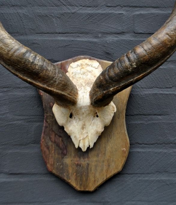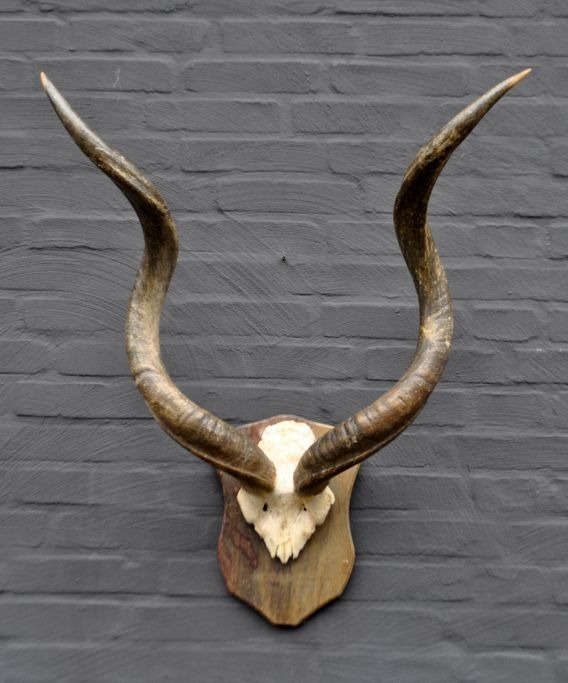 Gevir af kudo, 20. årh. Monteret på træplade. H: 90 cm.
