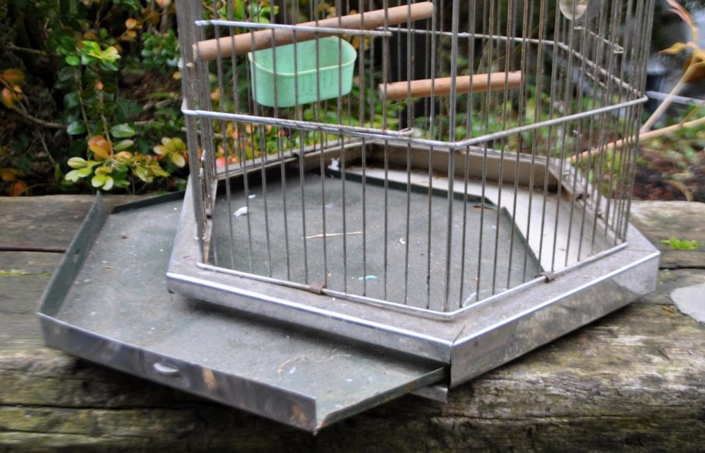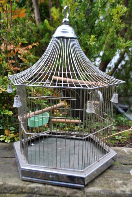 Sekskantet fuglebur i metal, tidlig 20. årh. Med en låge, to skydedøre, to træpinde, spejl, gynge og madtrug. Bund kan trækkes ud som skuffe til rengøring. Inkl. krog til ophængning. H: 45 cm. B: 34 cm.