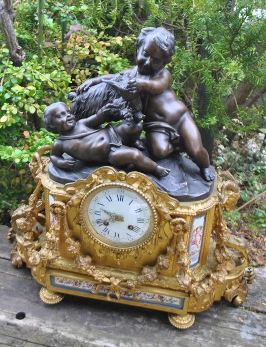 Stort fransk kaminur i bronze, tidlig 19. årh. Topdekoration i form af to putti og en gedebuk. Urhus i lueforgyldt bronze med guirlander og vædderhoveder. Ligeledes porcelæns plaquetter med blomster og putti. Urskive i hvidt emalje med romertal og arabertal. Standart urværk med snorophæng.