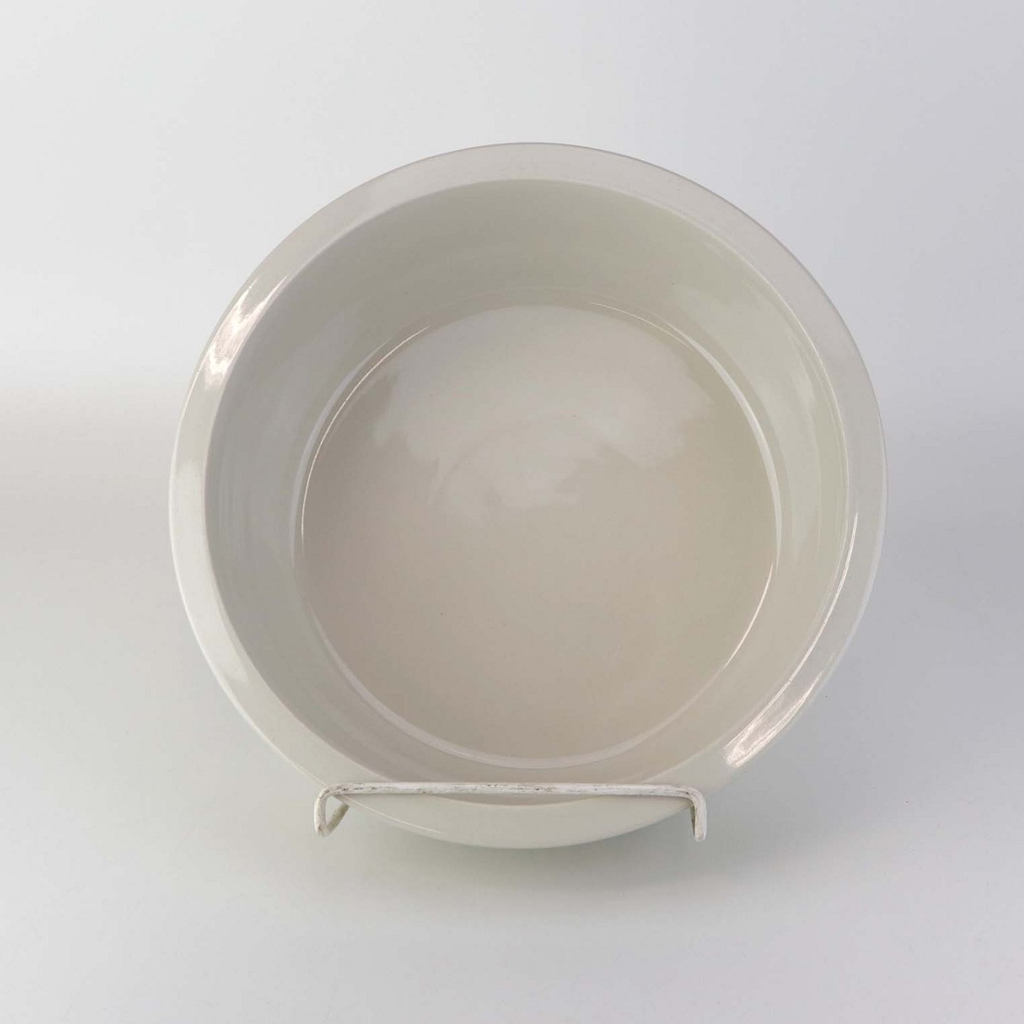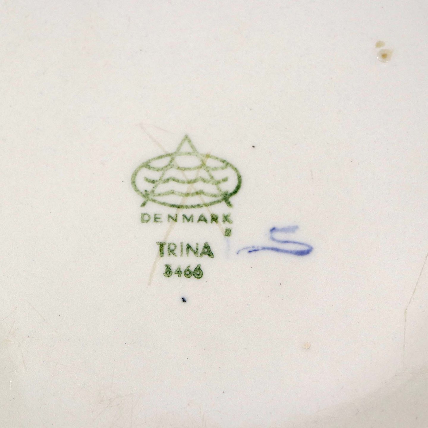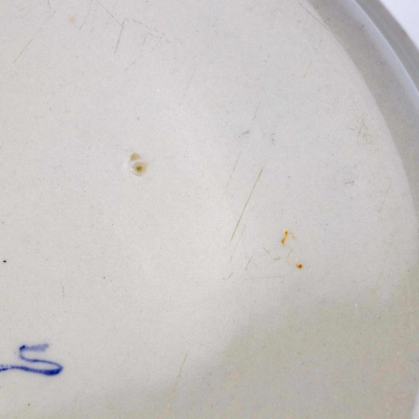 Fremstår med let ridset bund og en blå plet under glasuren på sidenkanten af skålen.