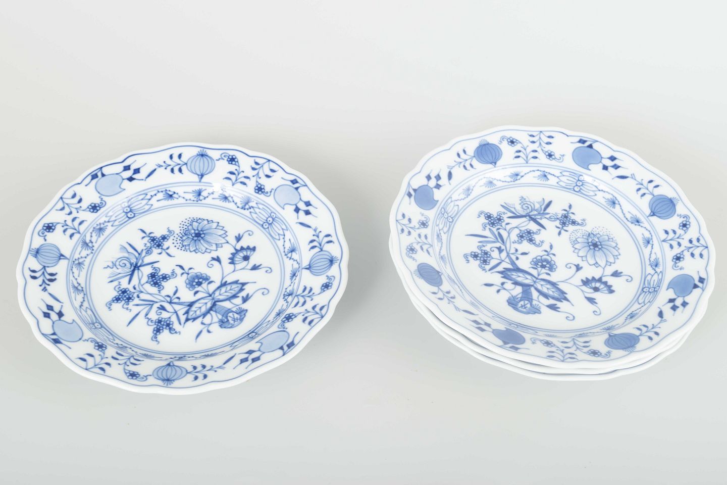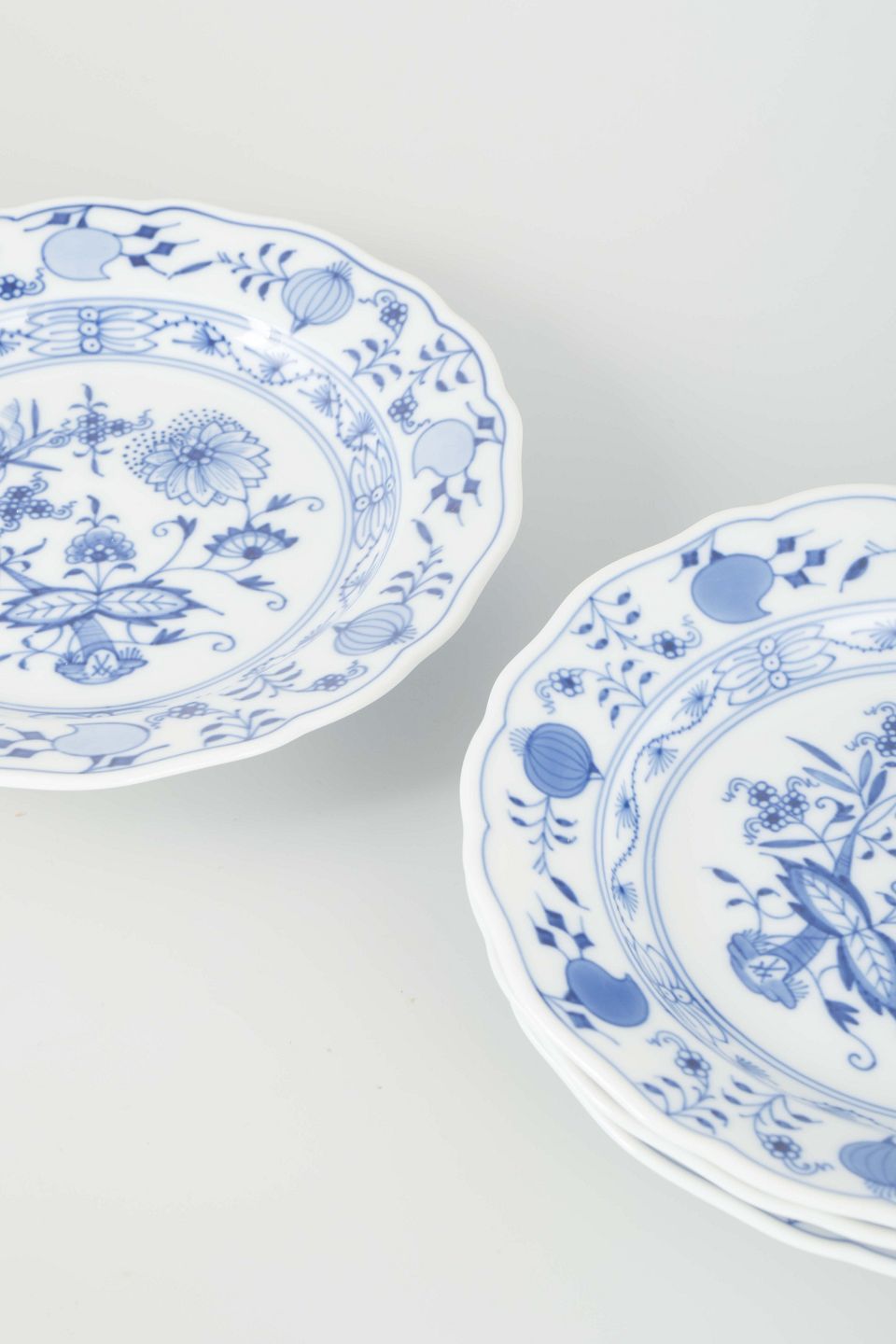 Fire håndmalede porcelænstallerkener i det klassiske “Løgmønstret” (Blue Onion) mønster. Dekoreret i underglasurblå med bølget kant og elegant ornamentik.