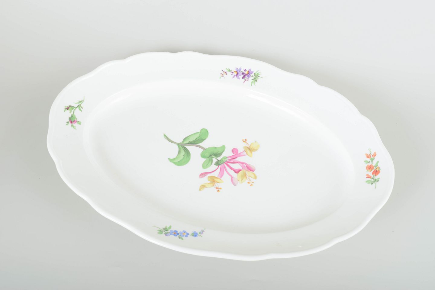 Elegant porcelain serving dish, hand-painted with multicoloured floral decorations. Classic scalloped rim with relief and refined detailing.