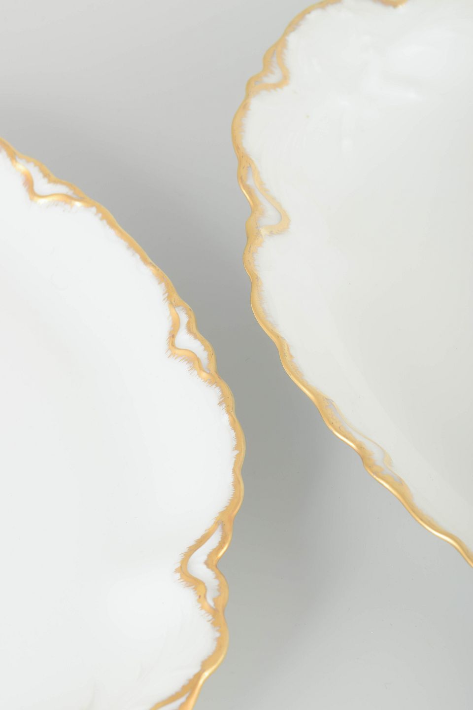 Elegant set of oval porcelain dishes in a warm cream tone with hand-painted gold edging and softly scalloped forms. A fine example of classic French tableware with subtle Art Deco influence.