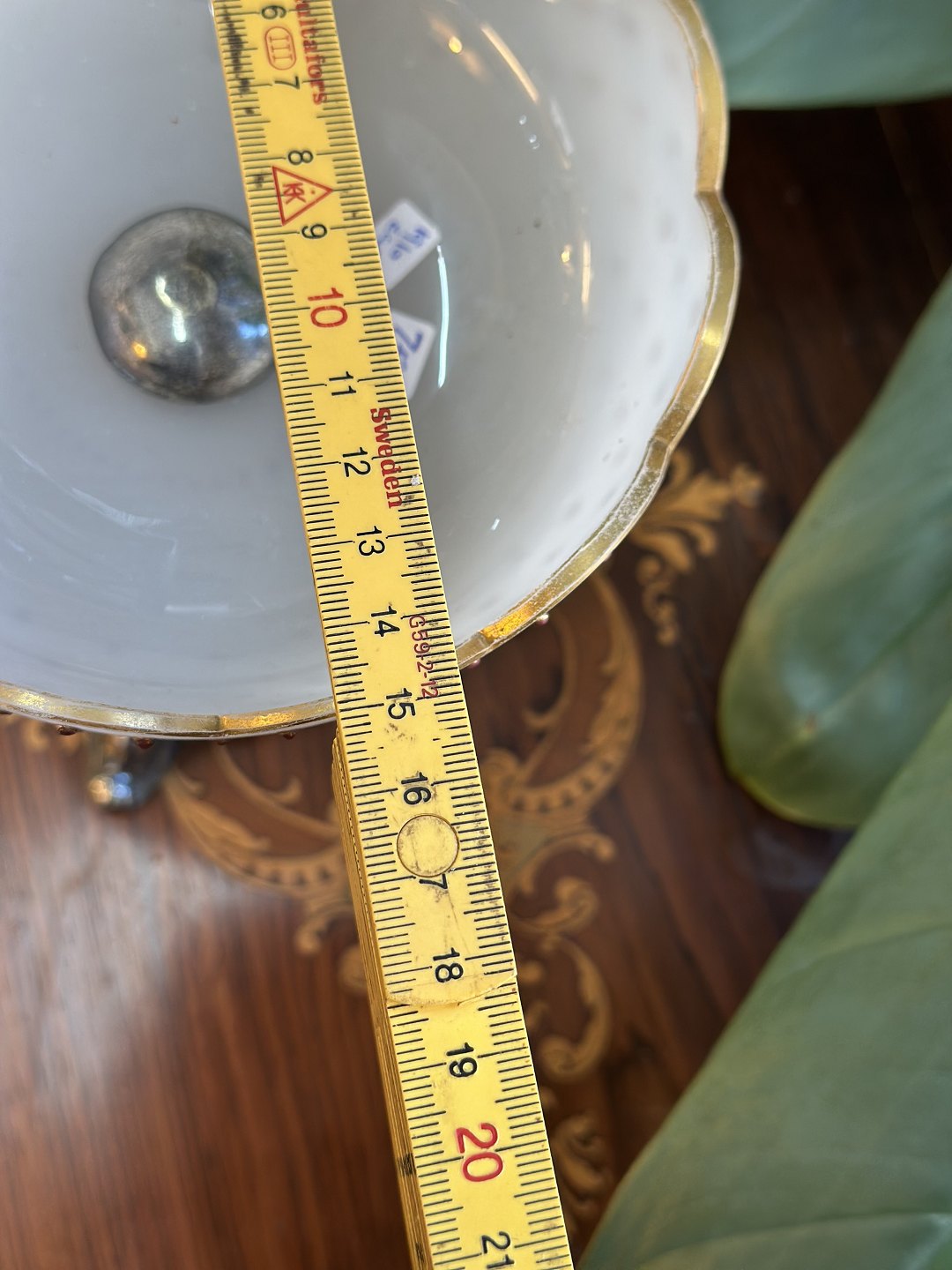 Vintage skål fra 1800 -1900 tallet , skålen er i opalin -glas (mælkehvidt glas ) med håndmalede gyldne prikker og guldkant , foden er i pletsølv med dekorative art nouveau - barokinspirerede detaljer , designet opaline glass fra slut 1800 -tallet