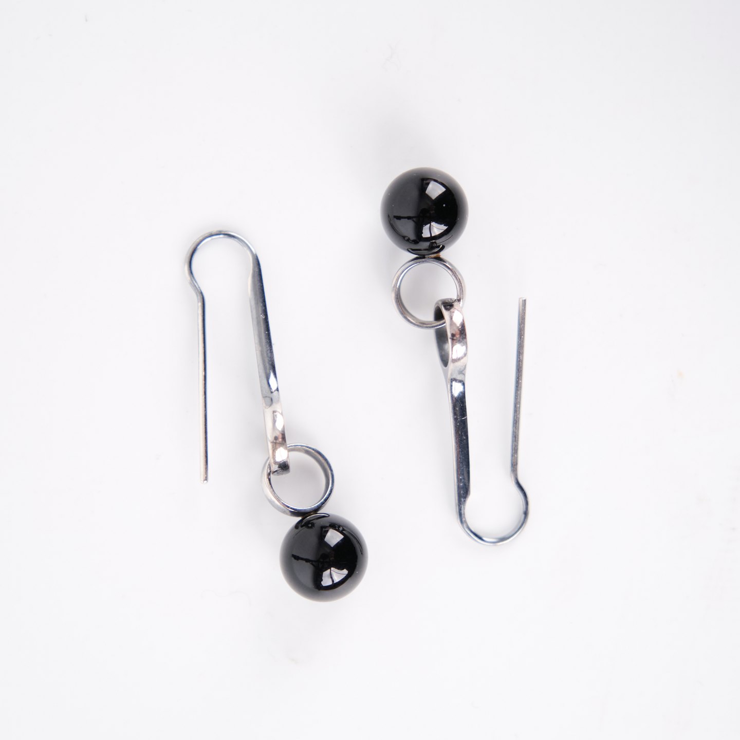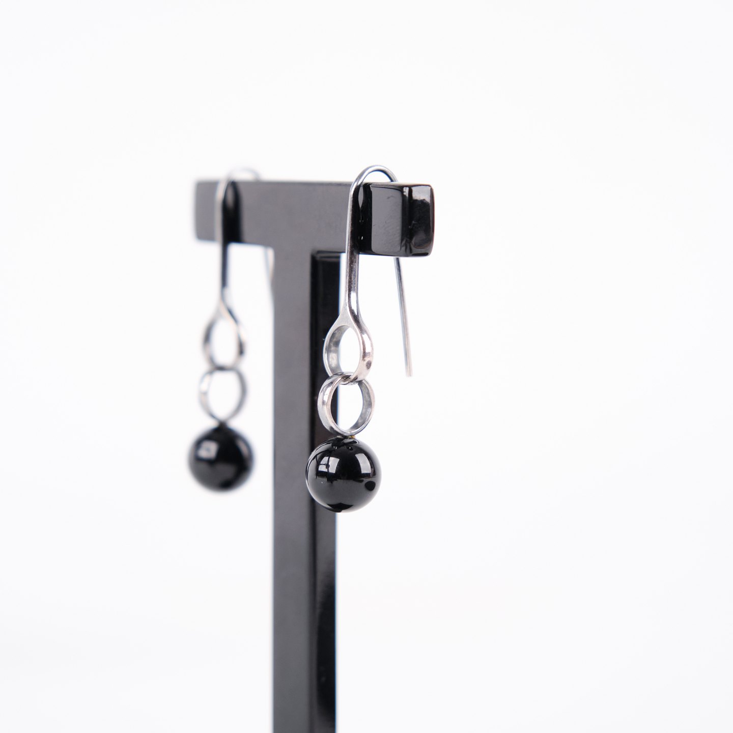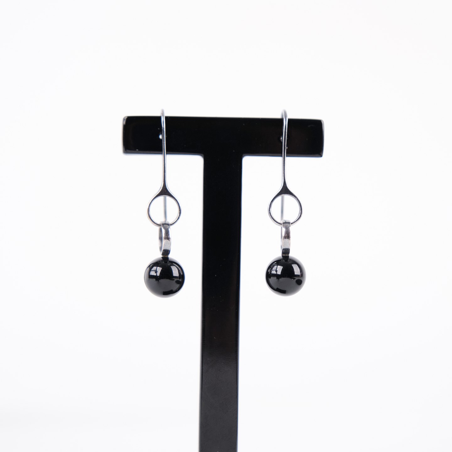Ørehængere i sterling sølv 925S, stemplet GJ 925 S, designet af Regitze Overgaard for Georg Jensen. Udført som elegante sphere-earrings med sort agat, kendetegnet ved enkelhed, rene linjer og tidløst dansk smykkedesign. Et klassisk sæt i kvalitetsmaterialer.