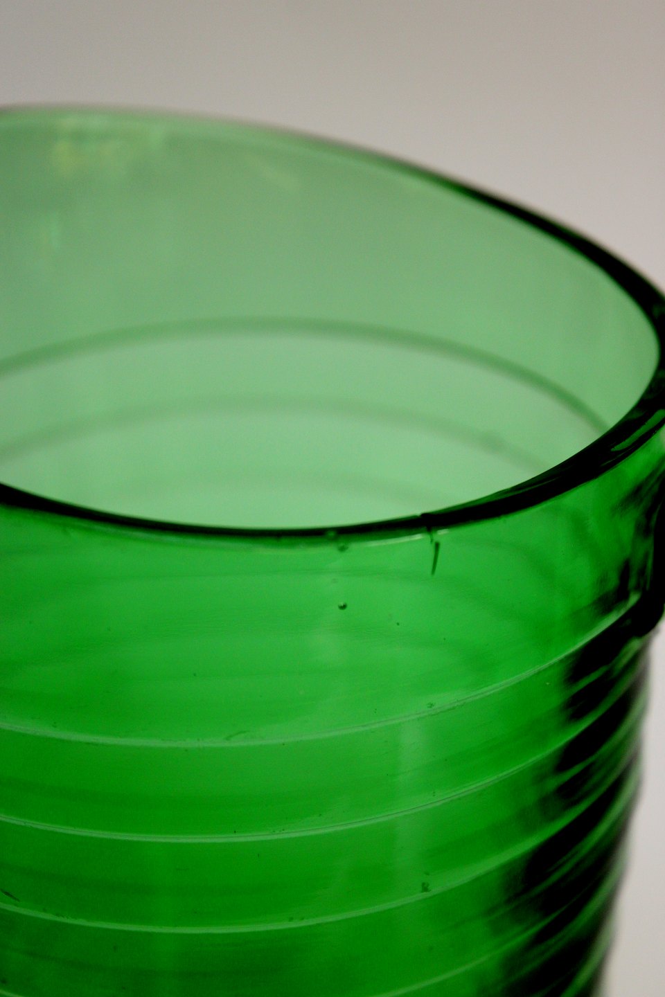 Holmegaard, Broksø presset glas 1938-1941, designet af Jacob E Bang. Transparent grøn kande. Højde 17 cm. Længde 17 cm. Produktions fejl "revne" i kanten. Pris: 175 kr. stk. Lager: 1