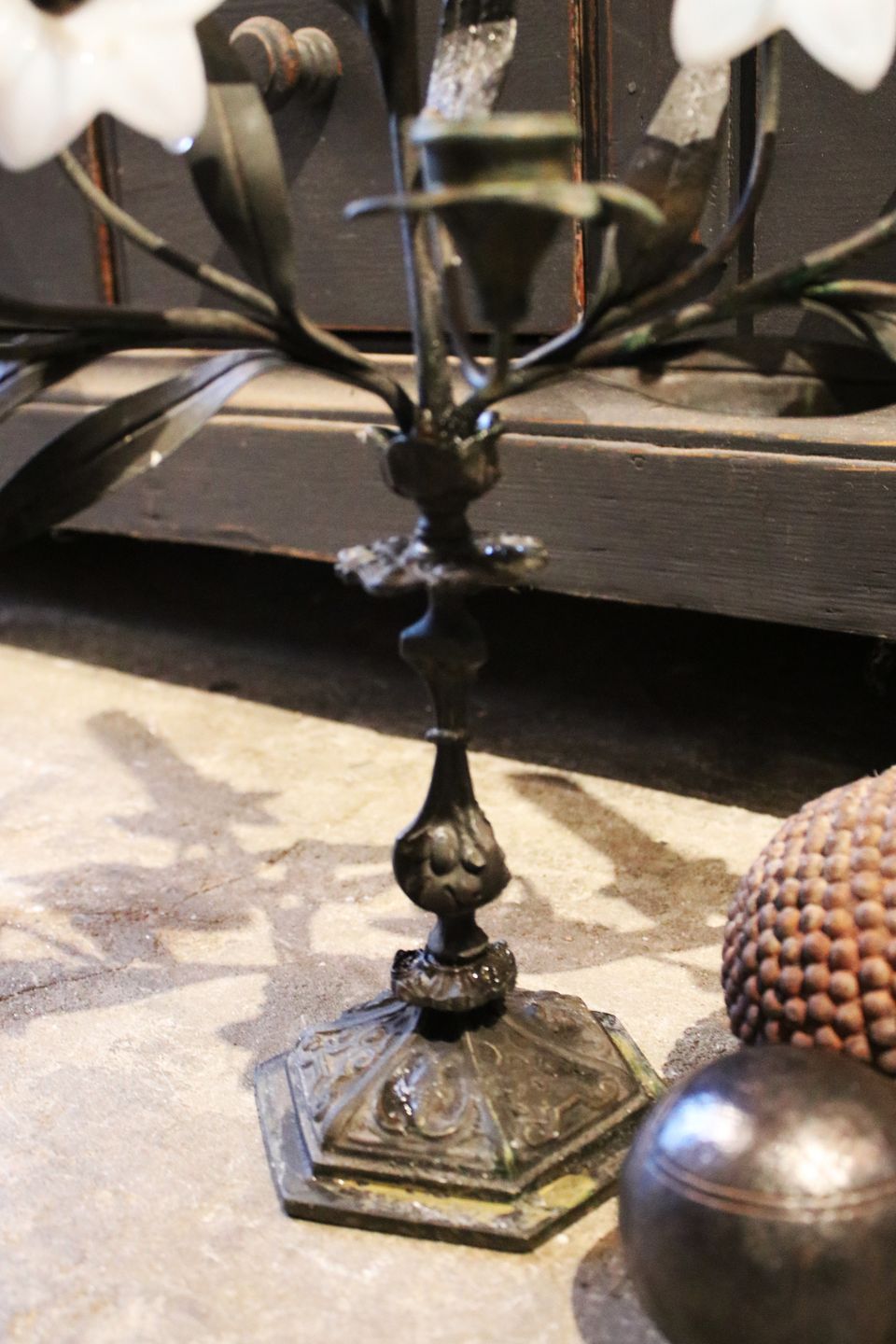 Antique, French candlestick in dark patinated bronze, decorated with 3 old white glass flowers...