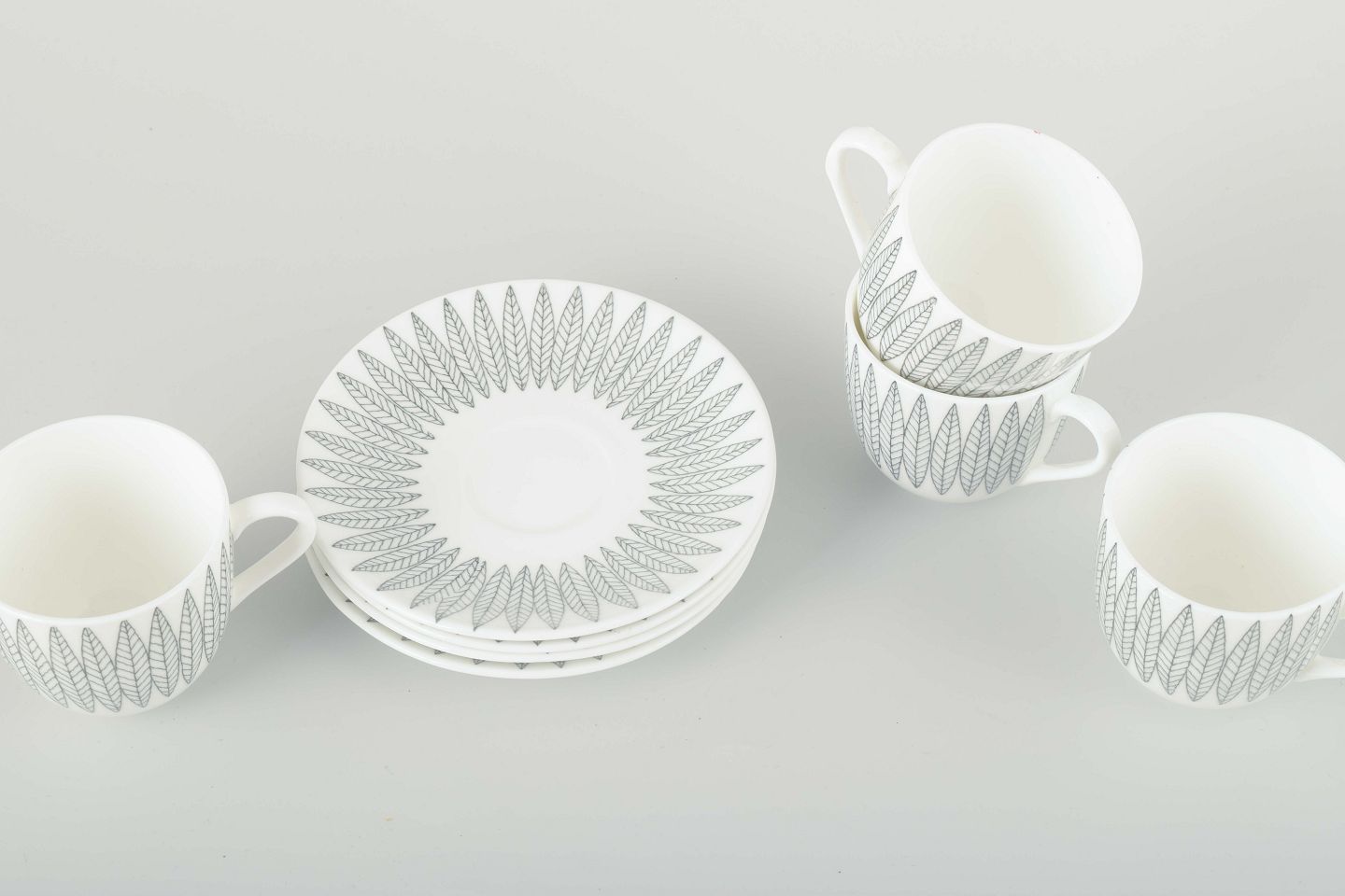 Fajance med det karakteristiske “Salix”-mønster i grå på hvid bund, designet af Stig Lindberg.