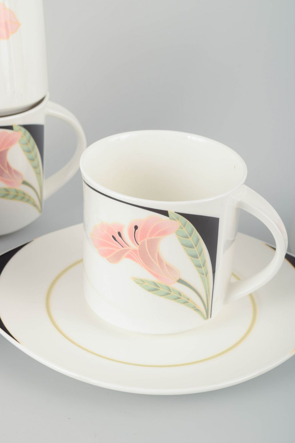 Six porcelain cups with matching saucers, decorated with hand-painted floral motifs in pink, green and black tones. The series combines clean lines and soft shapes with an elegant postmodern aesthetic.