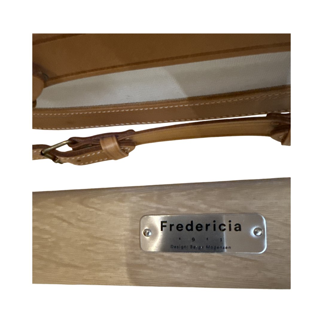 Smuk og autentisk udgave af Børge Mogensens ikoniske Spanske Stol, udført i massivt egetræ med sæde og ryg i kraftigt kernelæder.