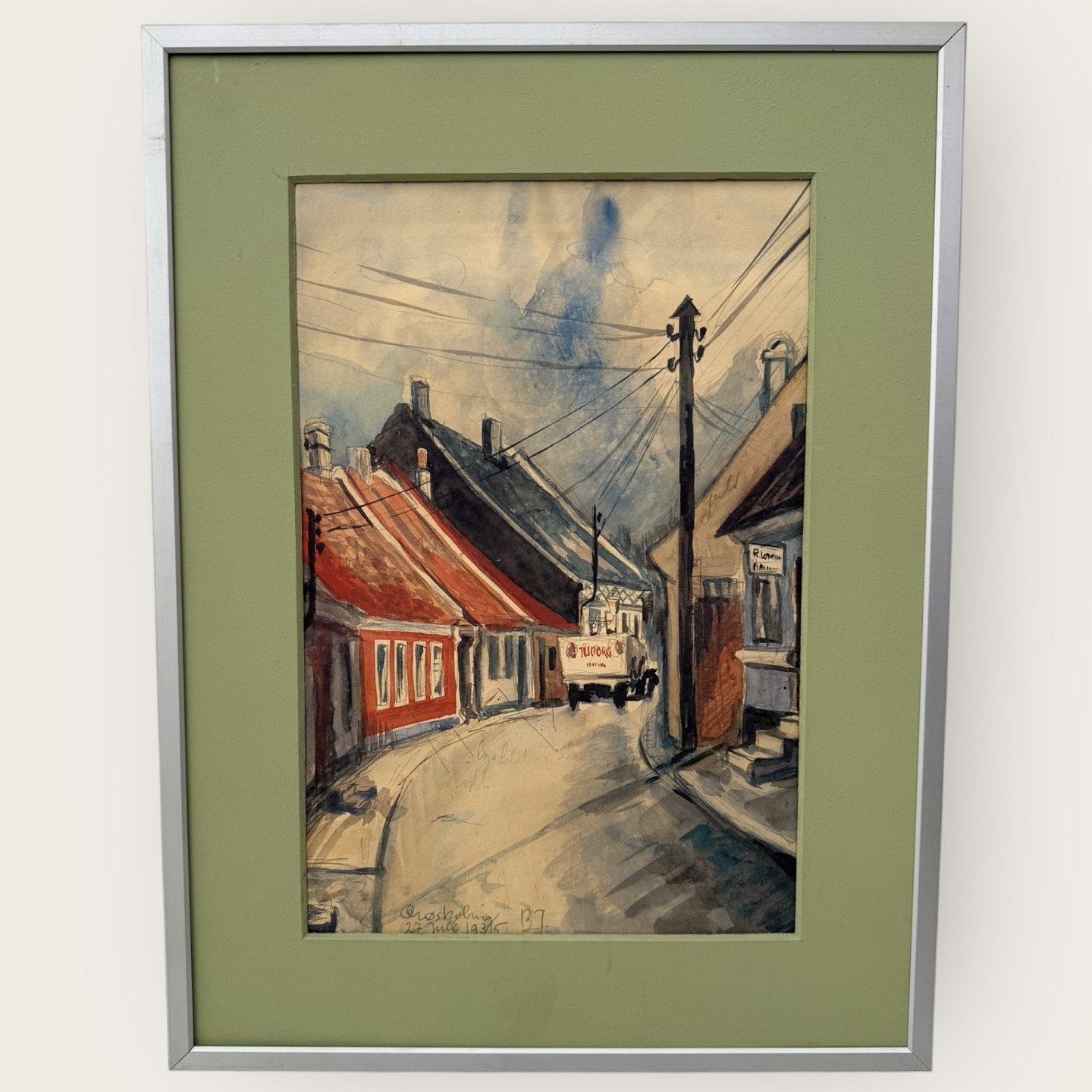 Akvarel, Signeret: B.J. 27 juli 1935 Ærøskøbing, Indrammet men uden glas, Mål: 20x30cm, med ramme 31,5x42cm
