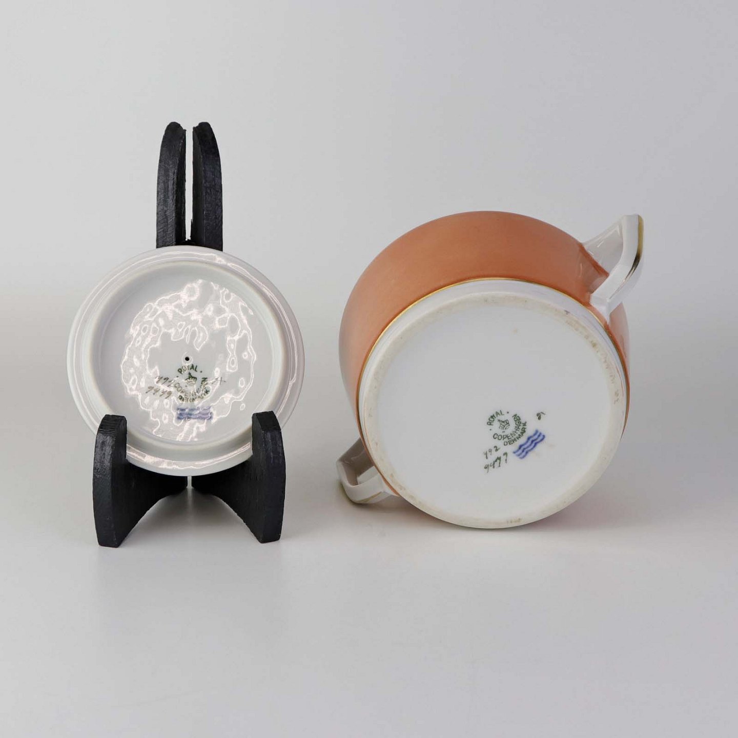 Service i glat hvidt porcelæn med orangerød dekoration over glasuren og guldkant