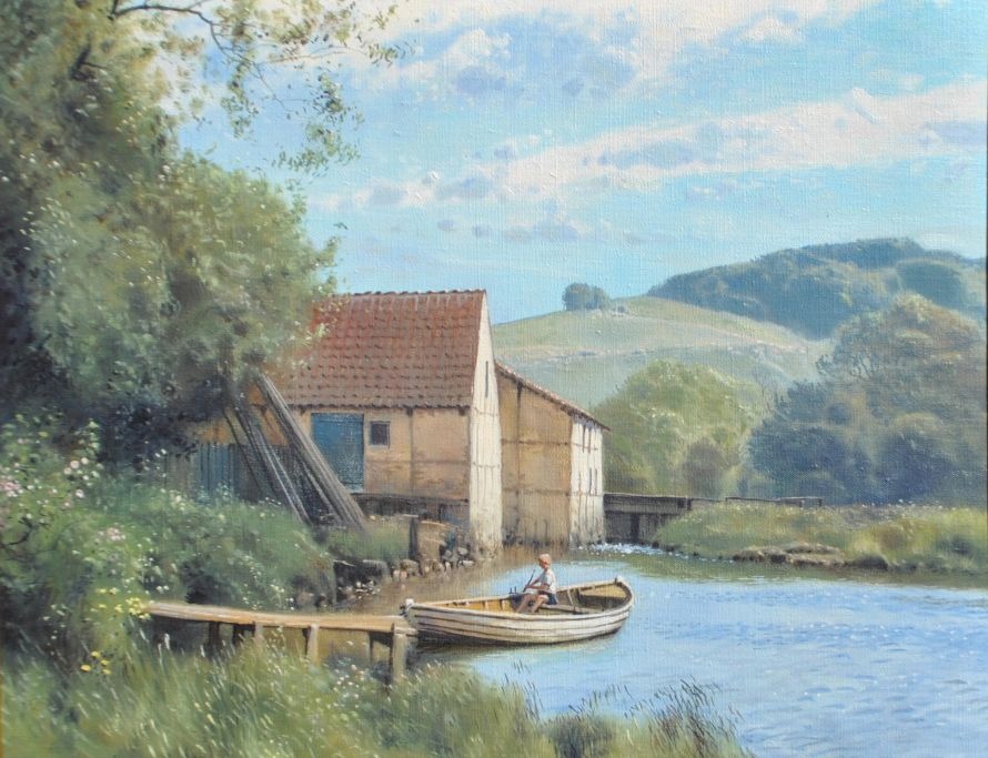 Walseth, Niels (1914 - 2001) Danmark: En dreng i en robåd på en møllesø. Olie på lærred. Signeret. 40 x 50 cm.
