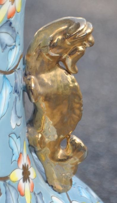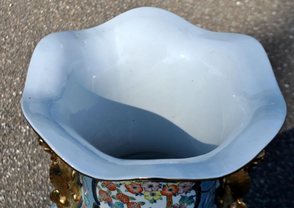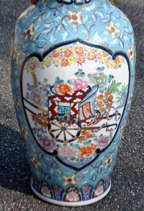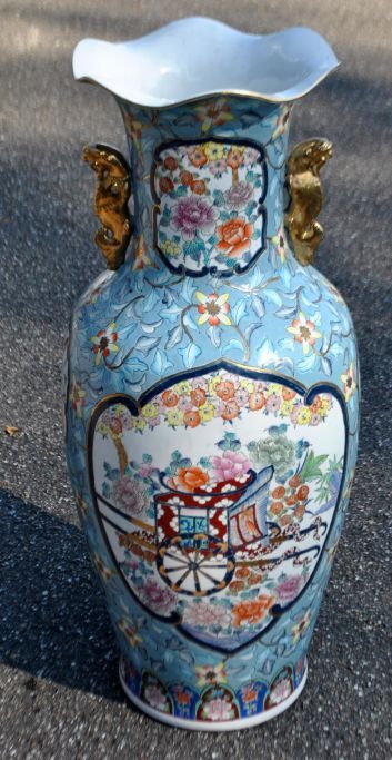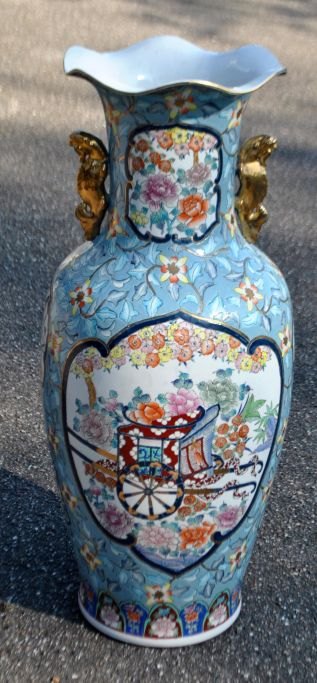 Large Chinese floor vase in porcelain, 20th century. Numerous polychrome decorations in the form of carriages with flowers, birds in flower bushes, etc. Gilded handles. Ruffled edge. Stamped. H.: 81.5 cm.
