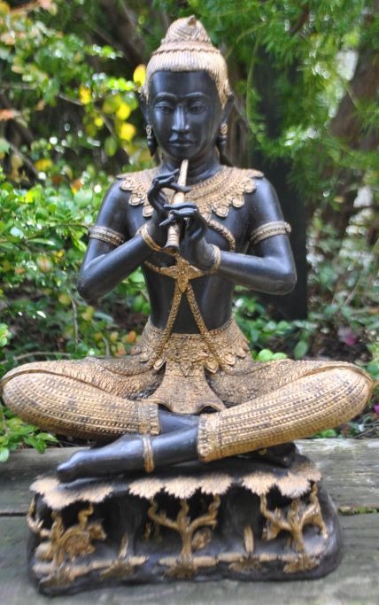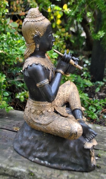 Flute-playing templar in partially gilded bronze, 20th century. Cire perdue. Seated on a pedestal with decorations of trees, including an elephant, hares and a cow. H: 36 cm. W: 26 cm. D: 19 cm.