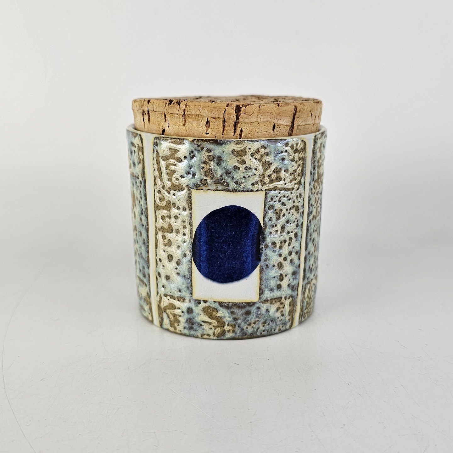 Krukke i fajance med abstrakt mønster i grønne og blå nuancer og korkprop